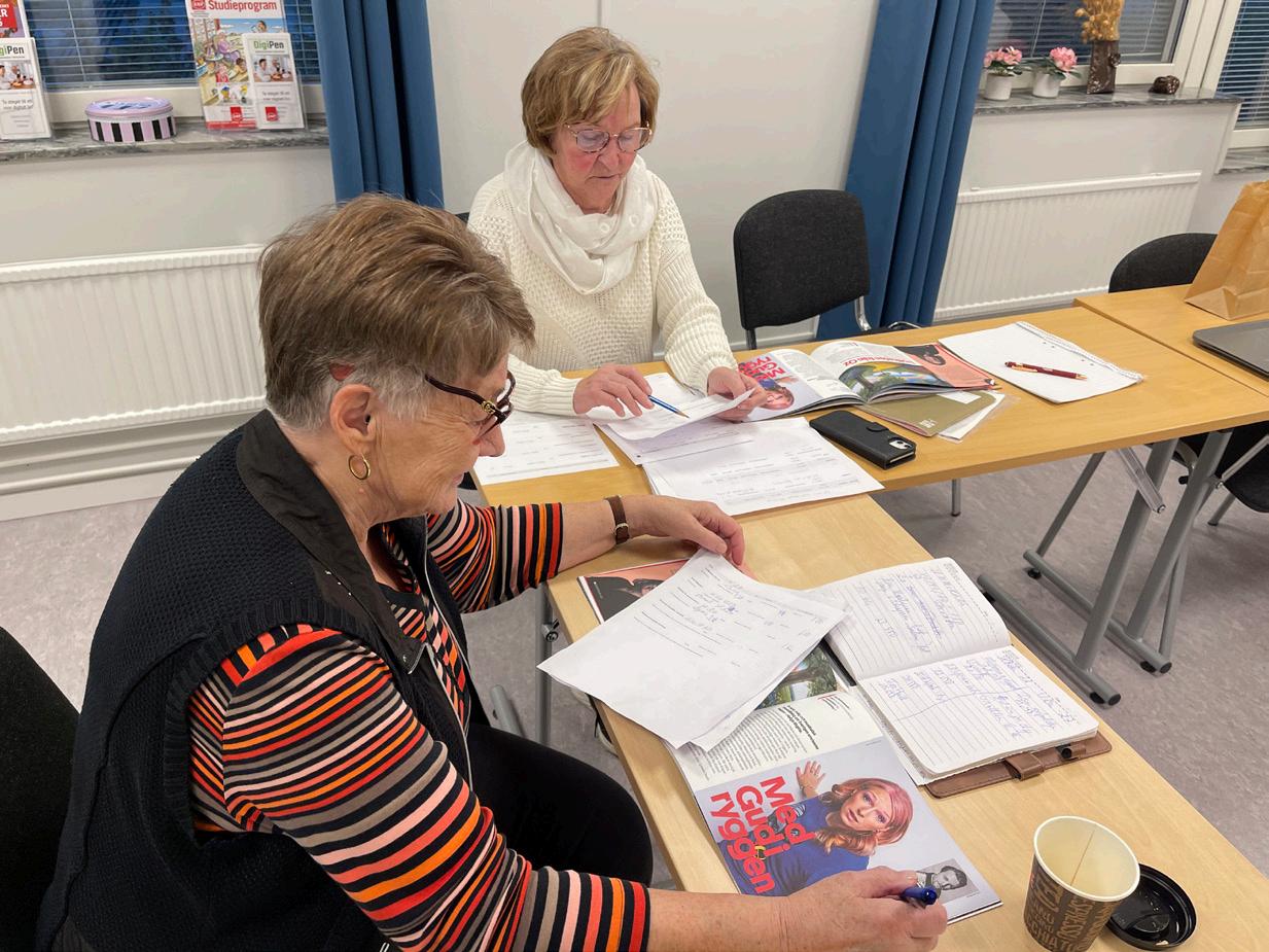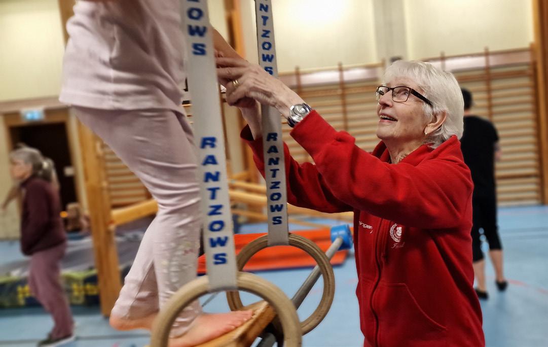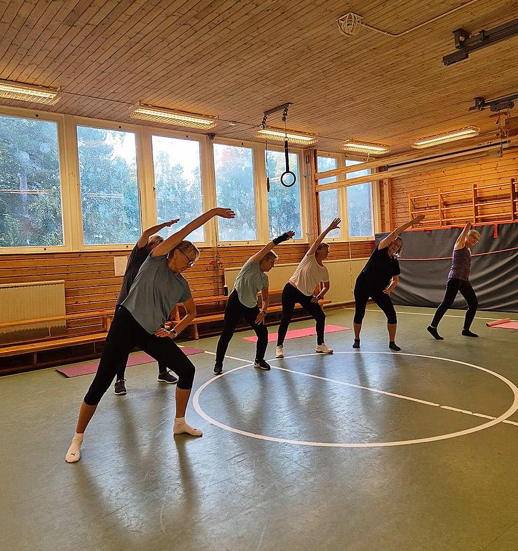 De första deltagarna kommer redan vid åtta och börjar umgås. Träningen startar halv tio och pågår en timme. Efteråt fikar de tillsammans, de sista går vid tolv. Någon av ledarna är alltid här vid den lilla receptionsdisken när det är seniorpass. Hjälper nya i gång, hälsar och är med och håller atmosfären levande. Fast det behövs inte. Flera av dem som är med i gruppen kommer fram och hälsar och pratar.