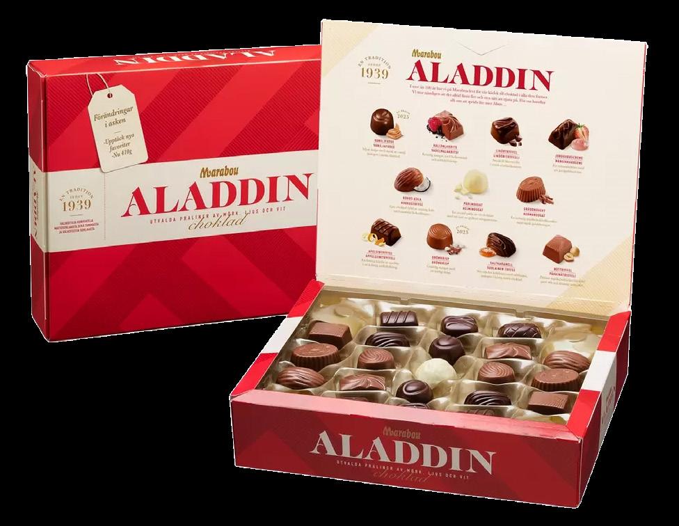 Choklad- och skumtomtar i all ära. Aladdin, den röda chokladfyllda asken som gjorde entré för 86 år sedan, är ändå mer eller mindre ett måste till jul. Innehållet har genom åren varierat och fortsätter att göra det med stort engagemang från oss chokladälskare. Praliner har gått och praliner har kommit. Ibland till högljudda protester, som när gamla klassiker fått ge vika för nykomlingar. Aladdin har berört och fortsätter att beröra oss. Vi hittar alltid några favoriter och några som vi helst undviker.