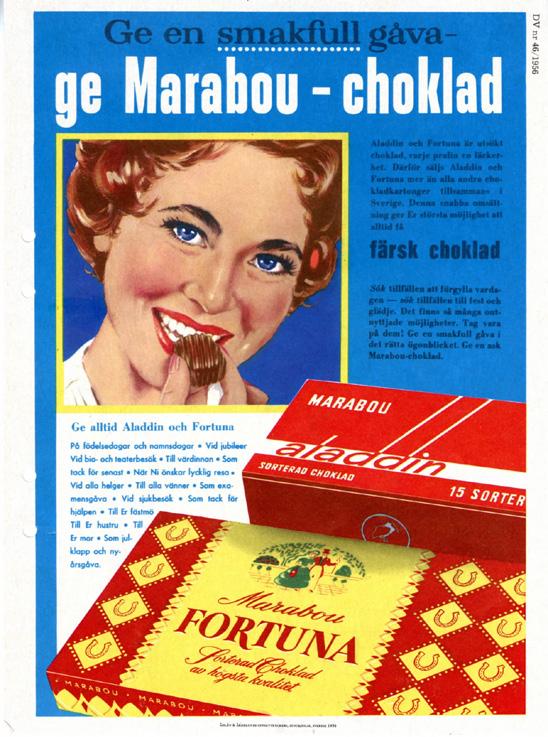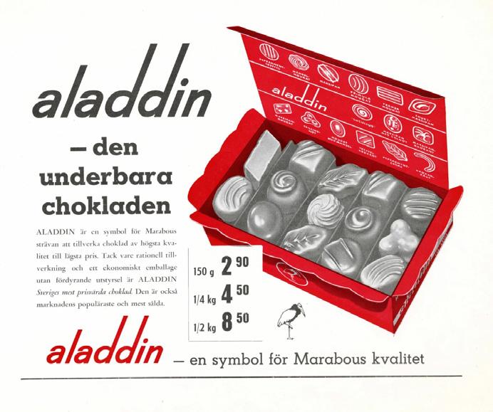 som då såldes i lösvikt, var flera hundra. Efter att ha sneglat på den engelska marknaden, där choklad paketerad i askar blivit populärt, lanserade Marabou i maj 1939 chokladasken Aladdin. Asken kom att förändra chokladmarknaden i vårt land. Namnet på asken hämtade man från historien om ”Aladdin” i sagosamlingen ”Tusen och en natt”.