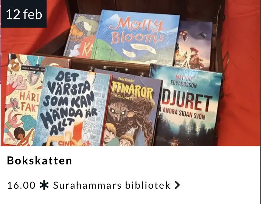 Föreläsning. Jonas Hallberg - Bakom mina solglasögon. Köpings bibliotek kl 18 – 19. Föreläsning. Portionen under tian – Talarkväll med Hanna Olvenmark. Laga mat som är bra för kroppen, plånboken och planeten. Tomaskyrkan, Västerås kl 18.30 - 19.30. Författarbesök. Göran Rosenberg. Aktuell med ”I lögnens tid”. Arboga bibliotek kl 18 – 19.