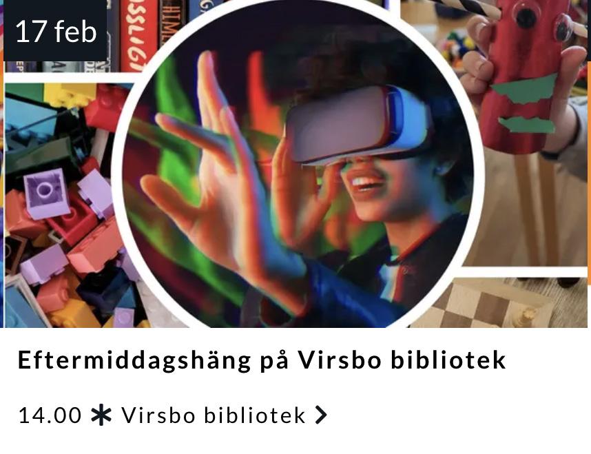 till 6 år i vuxet sällskap. Västerås Konstmuseum kl 10.15-11.30. Innebandy. IBK Hallsta-Västerås IBS. Div 2 herrar. Nibblehallen kl 19. Ishockey. VIK-Modo. HockeyAllsvenskan herrar. ABB Arena Nord kl 19. Musik. Lite Fetare. Sväng, groove och feststämning. Global Living, Västerås kl 20.