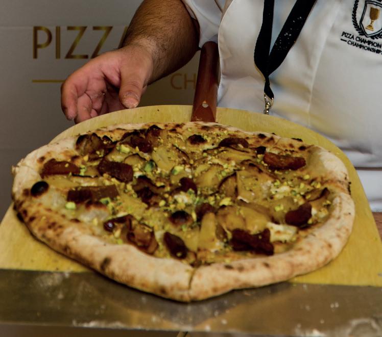 Serhats prisade pizzor. I cirkeln överst: ”Årets Dessertpizza”. Päron, äpple, torkade aprikoser och chevre. I cirkeln underst: ”Årets Gourmetpizza”. Pumpapure, Taleggio, Salsiccia, tryffelolja, torkad grönkål och parmesan.