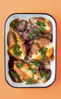 Zet het geheel 40 minuten in de oven, tot de zoete aardappels gaar zijn en de falafel bovenop goudbruin is.