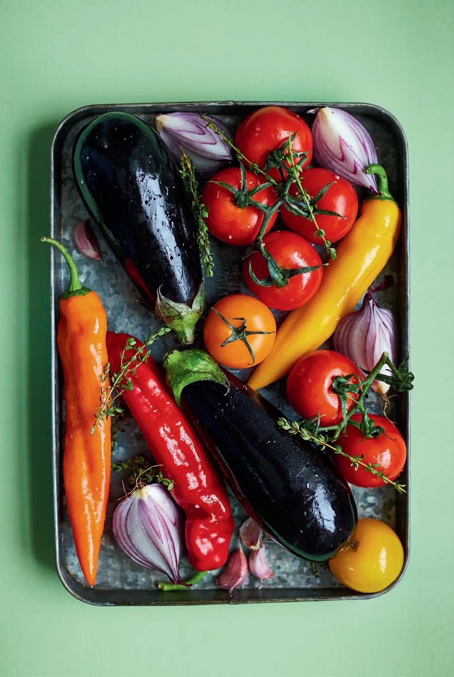 Leg de hele aubergines, paprika’s, tomaten, ui, tijm, knoflook, olijfolie en 1 theelepel van het zout op een grote bakplaat en schep alles met je handen om.
