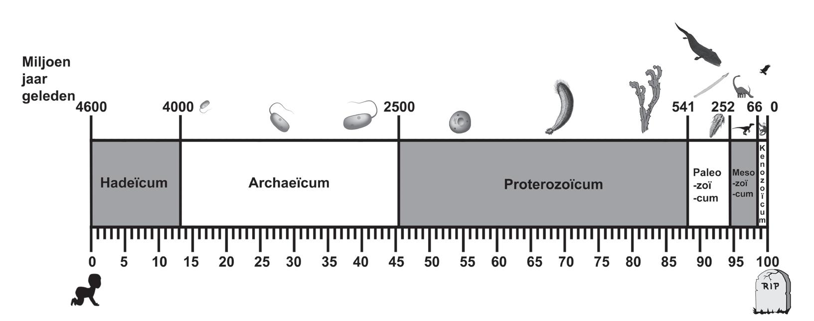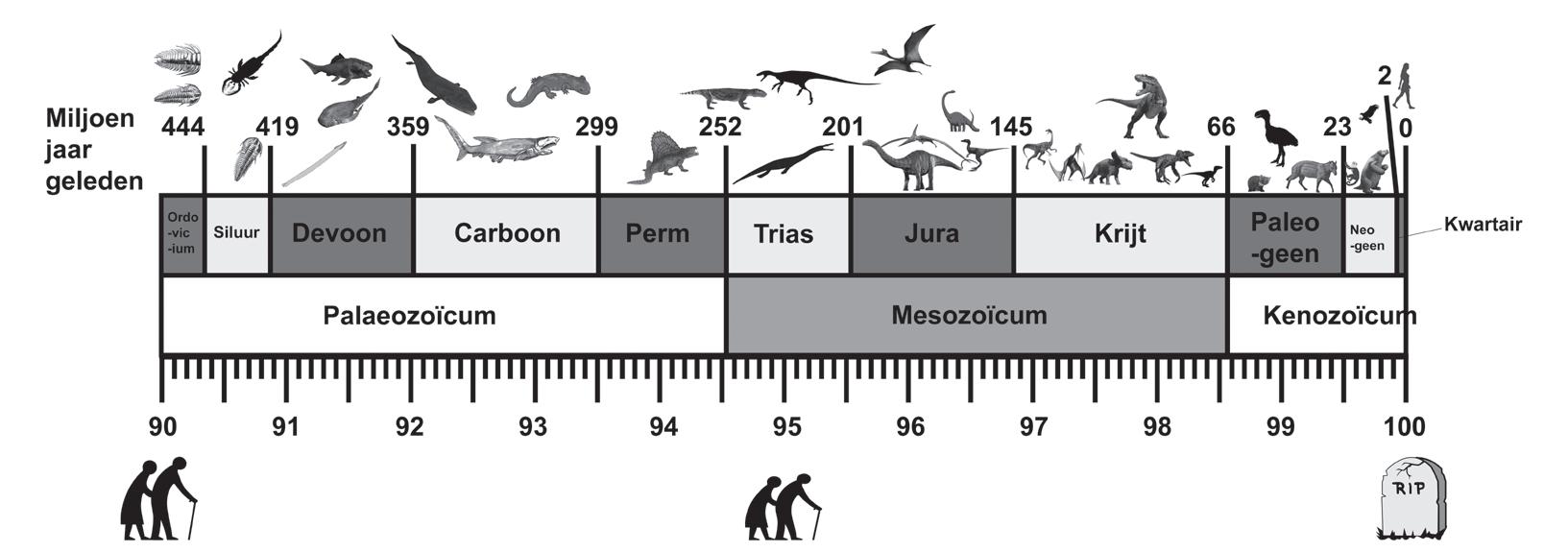 De geschiedenis van de aarde vergeleken met een mensenleven van 100 jaar.
