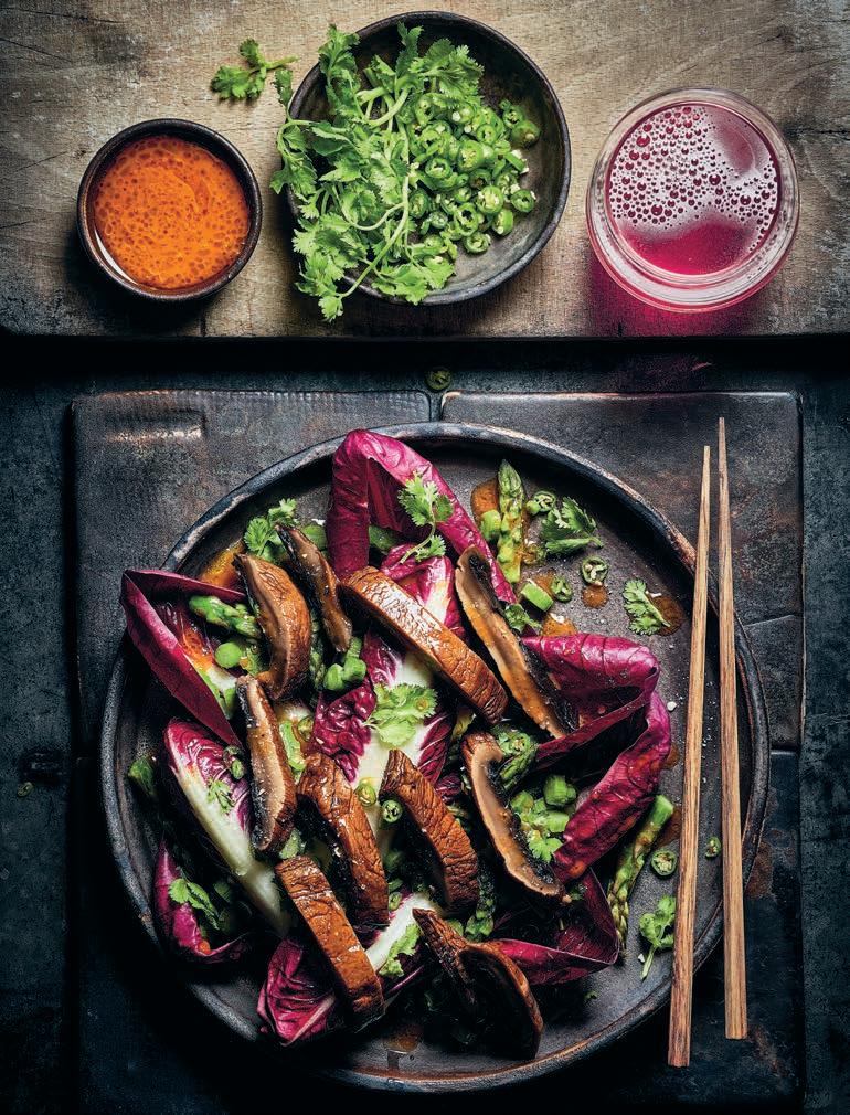 / 05. Zeef de marinade van de portobello’s. Breek hele bladeren van de radicchio en leg ze op elk bord, leg er een royale schep asperges op en besprenkel met de sesamsaus. Garneer met vers gesneden chilipeper, koriander en de gemarineerde portobello. Eet met stokjes of vouw de radicchiobladeren op en eet met je handen.