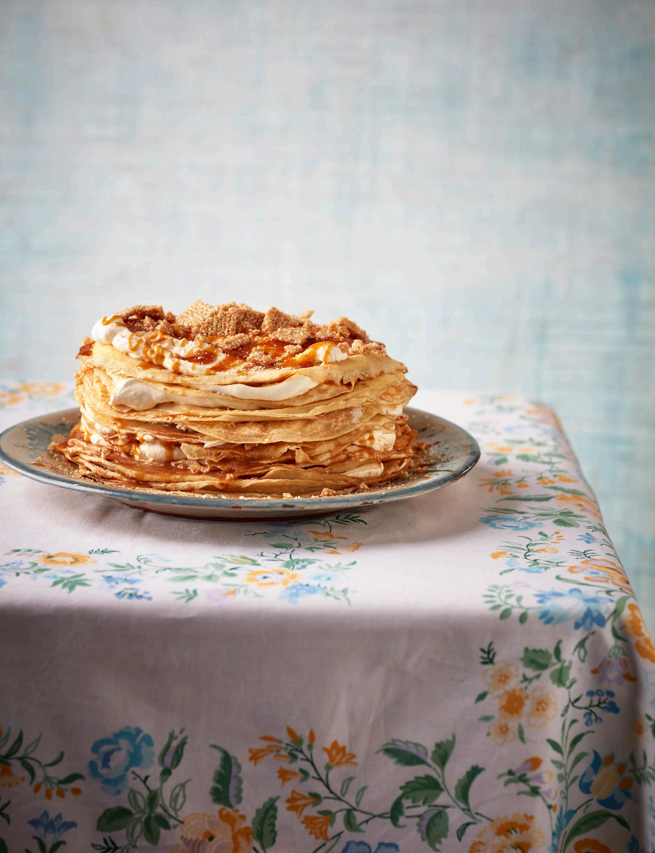 To assemble the cake, place one pancake on a serving plate, spread 2–3 tablespoons of the cream filling evenly over the pancake, then put another pancake on top, spread over 2–3 tablespoons of caramel sauce and sprinkle over some of the crushed sesame snaps. Keep alternating layers like this until you have used up all the pancakes. Decorate the top with the remaining cream filling, a drizzle of caramel sauce, the fourth packet of sesame snap biscuits, broken into shards/pieces, and any remaining crumbs.