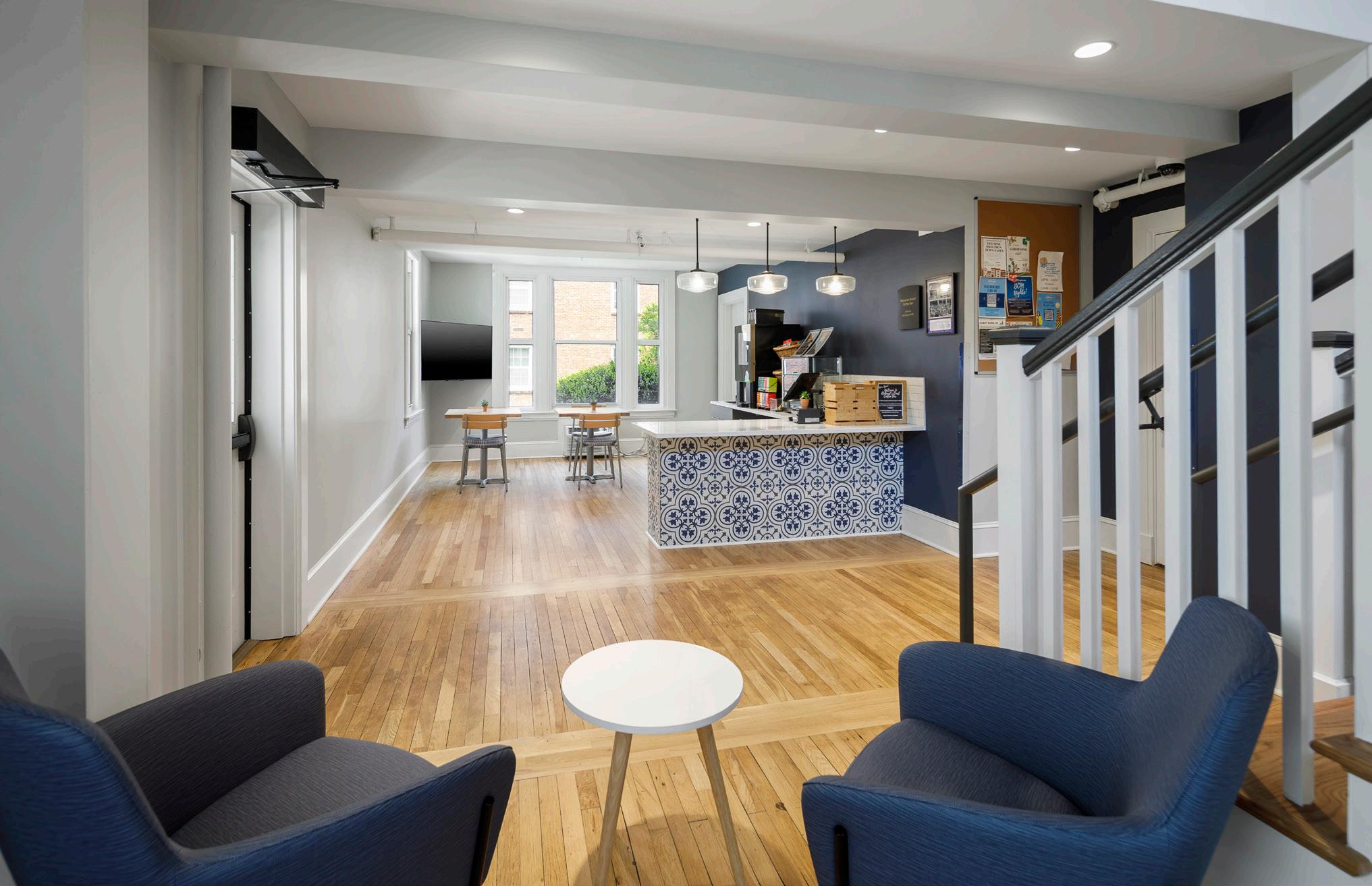 The scope included structural repairs and modifications to the existing wood frame, a new elevator, and all new mechanical, electrical, plumbing, and fire protection systems. The renovations also included a new custom staircase with common spaces, a coffee bar, a student lounge, and study rooms. The exterior renovations included restoring the front porch, back terrace, and the original masonry point-up.