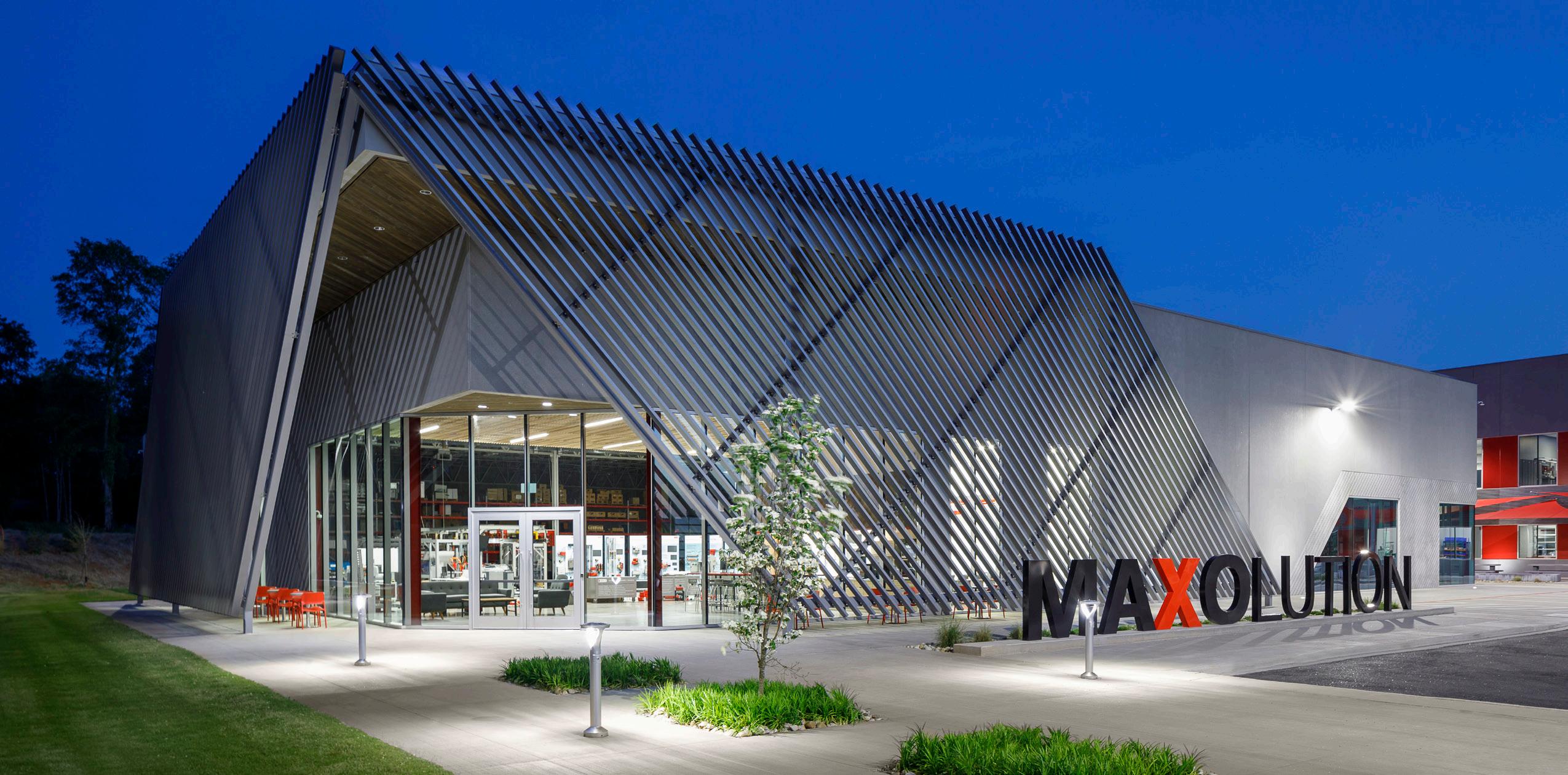 The ‘Maxolution’ building is distinguished by the aluminum screen at the entrance, whereas the assembly building features red and wood accents, the linear formliner, and red sun sails. The buildings are each recognizable, so employees can identify with them and develop a place of belonging. At the same time, because both buildings are constructed of precast concrete panels, they are aesthetically connected to each other and to the other precast concrete structures on the corporate campus.