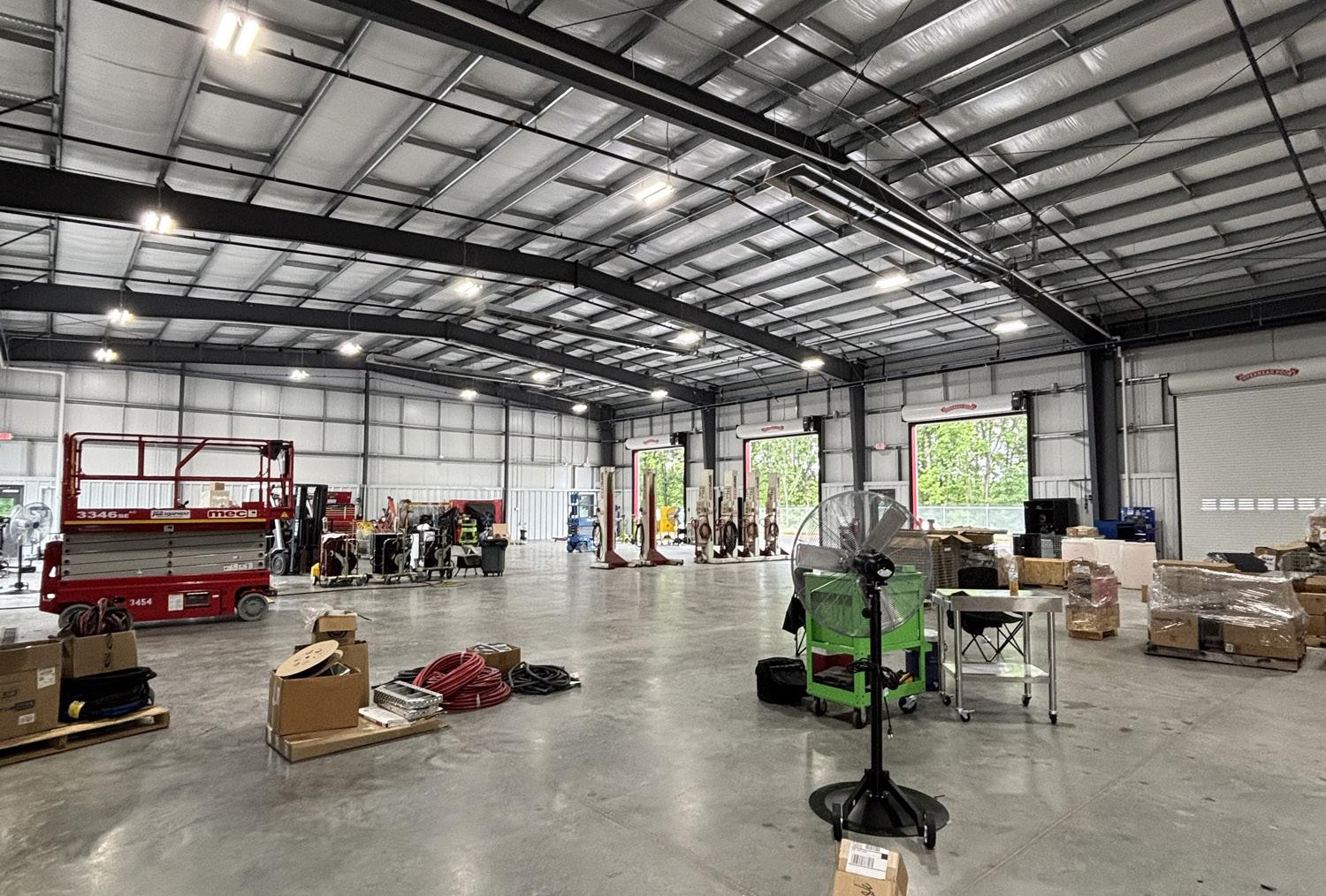 The pre-engineered facility is approximately 40,000 SF and includes wash bays, service bays, a break room, restrooms, offices, a locker room, storage space, a conference room, warehouse storage, and a covered patio.