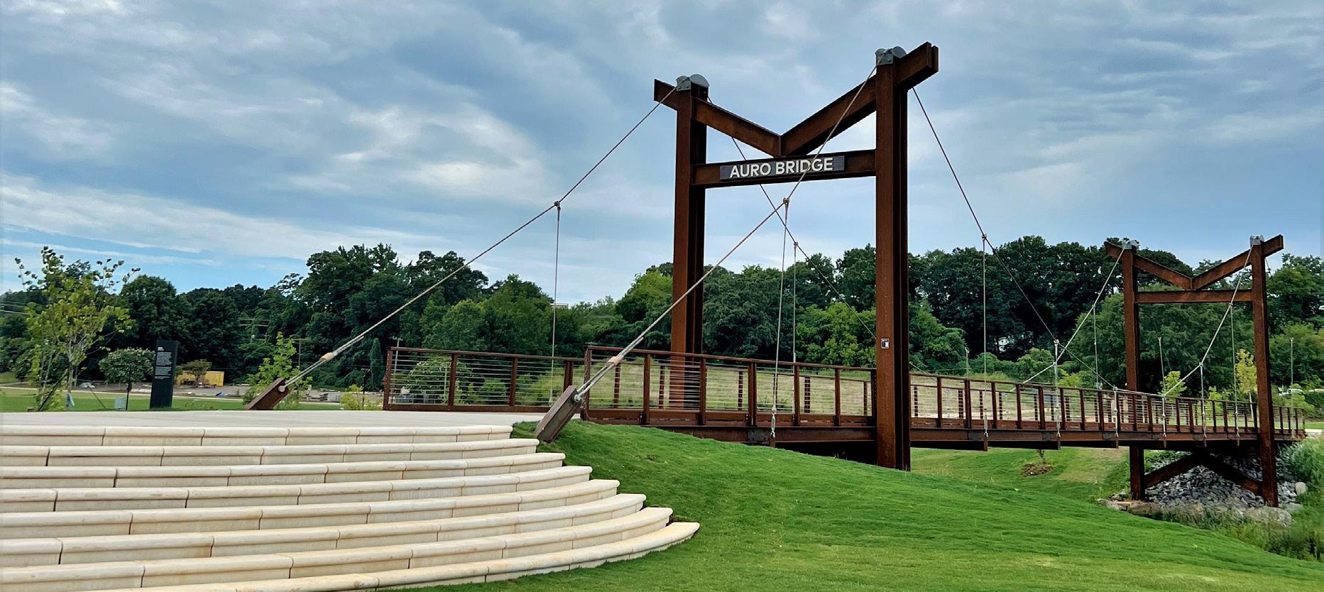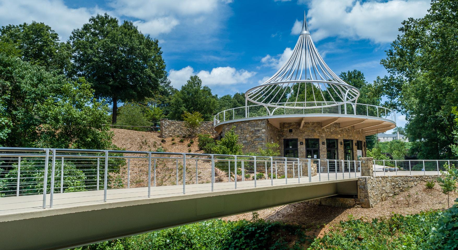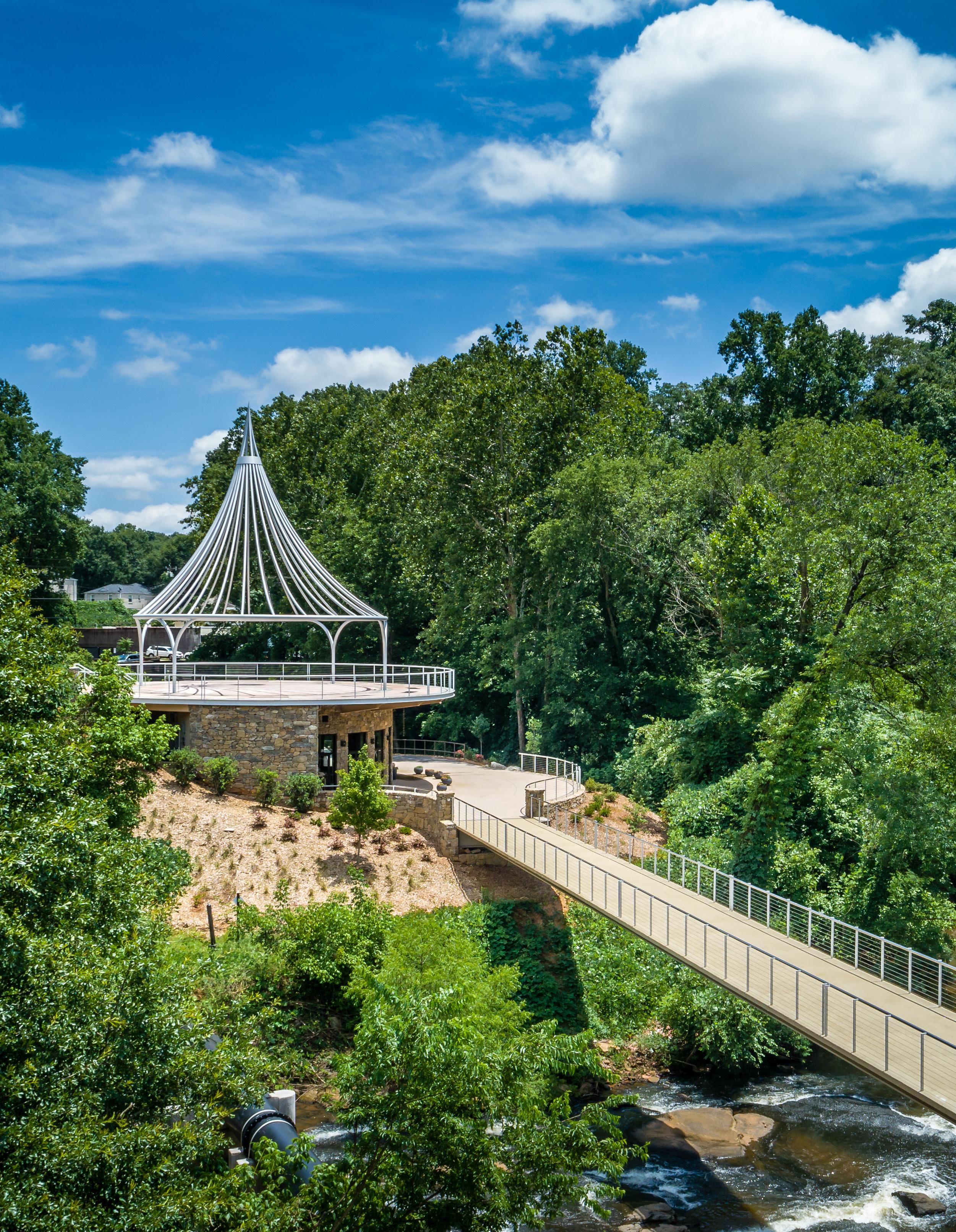 Greenville’s newest park features four state-of-the-art playgrounds, including a 4,100-square-foot splash pad, two expansive green spaces, covered picnic tables, and a 10,000-square-foot welcome center with restrooms, a first-aid station, and flexible event space. The project included the construction of pedestrian bridges spanning the Reedy River, which allow for pedestrians to access other parts of the Swamp Rabit trail and neighboring businesses.