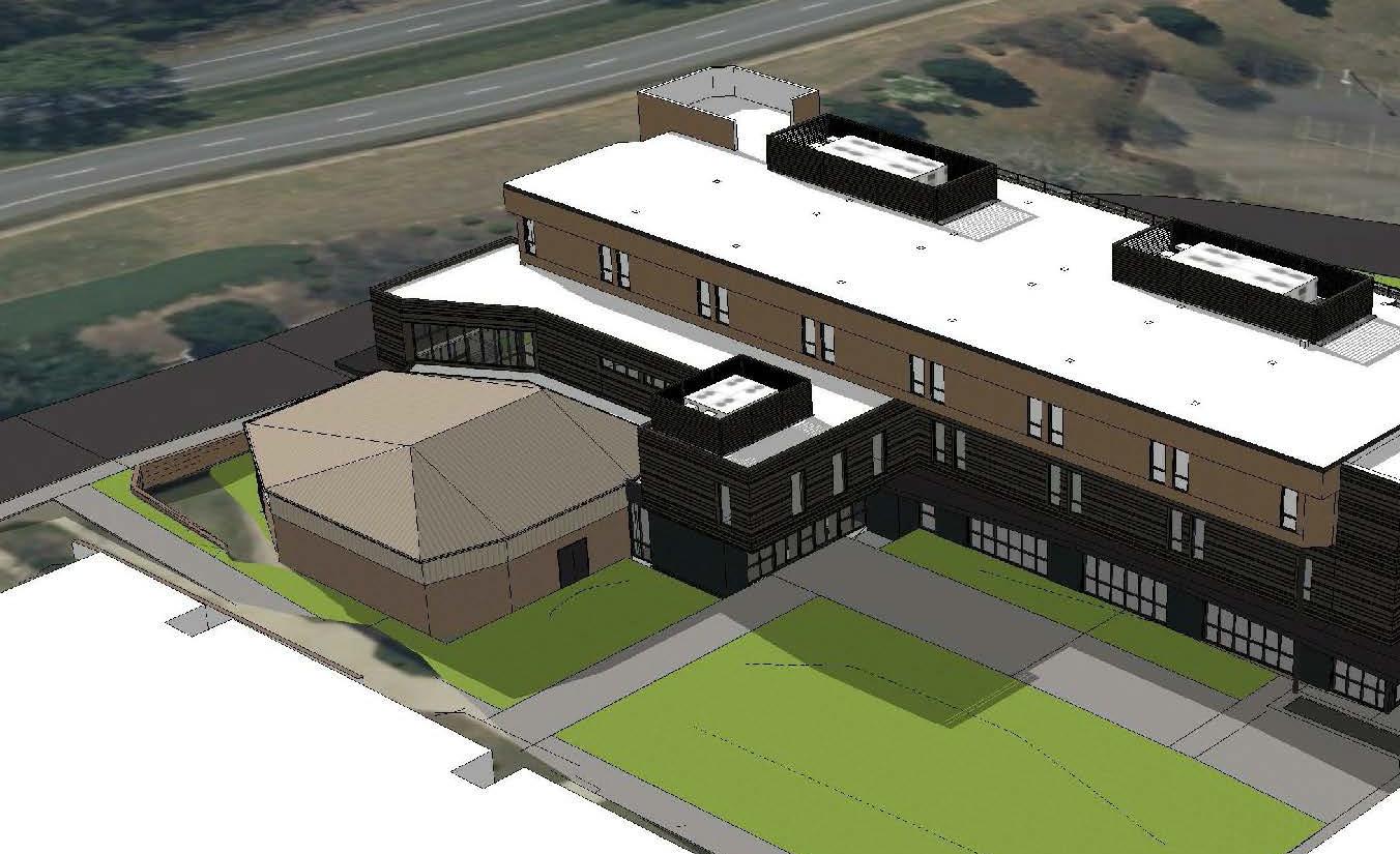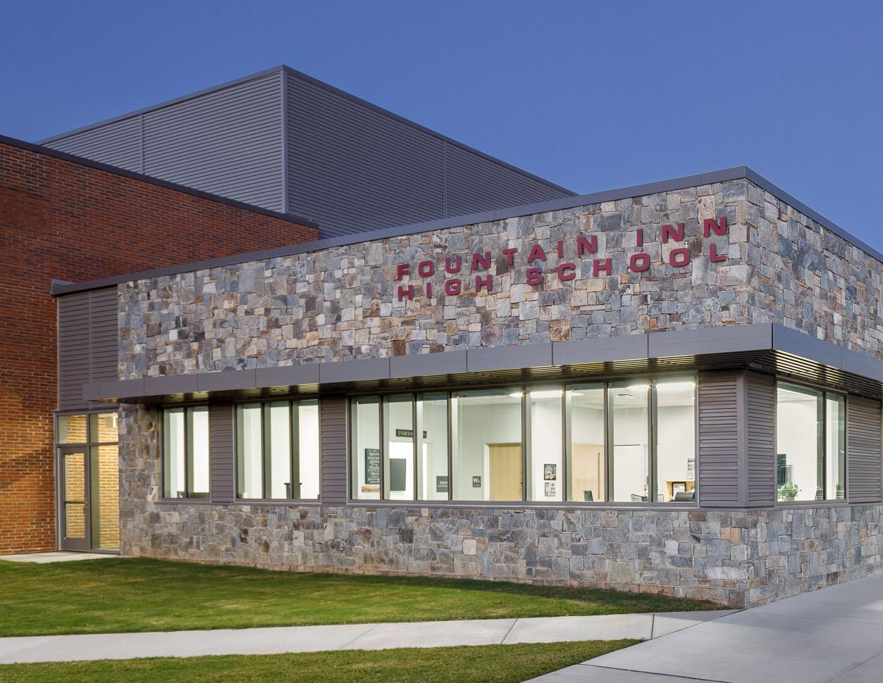 The new Fountain Inn High School accommodates 1,000 high school students, with the added benefit of being able to expand to hold 2,000 as the City of Fountain Inn grows. The 230,000 SF space features specialized labs and project-based learning facilities to integrate the STEAM-based advanced manufacturing education curriculum. The campus location near high-bay, tech-rich industries helps pave the way for student’s futures. The high school also includes a gym, classrooms, art space, administration offices, theatre, and kitchen. These academic studios border central common areas to encourage collaboration while allowing teachers to maintain visual control. This area features roll up doors and moveable walls enabling expanded classroom space. The site includes paved circular traffic areas for student drop off along with teacher (88 spaces) and student (381 spaces) parking lots and areas where additional parking can grow with future students. Includes a fire loop paved road around the entire campus for fire truck access. The school also offers two practice fields, a baseball field, a softball field, a football stadium with track and field, and four tennis courts.