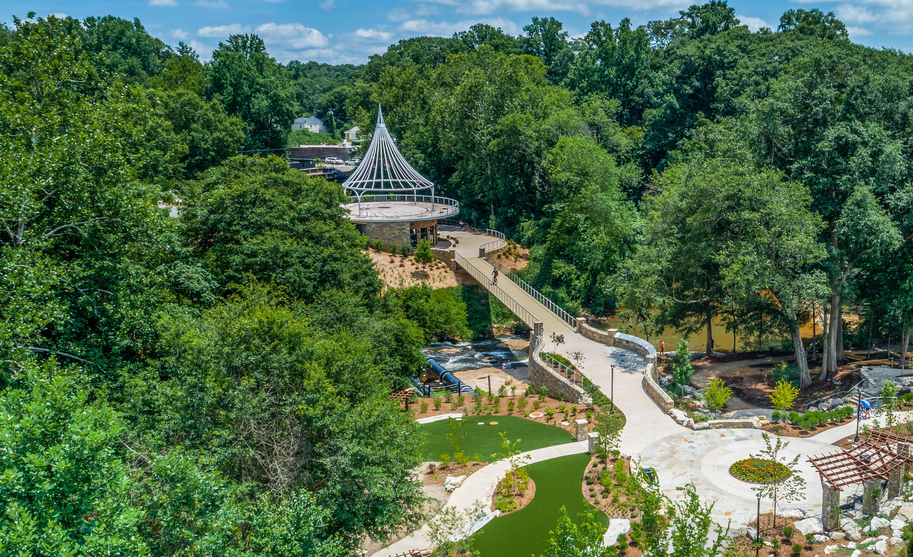 Greenville’s newest park features four state-of-the-art playgrounds, including a 4,100-square-foot splash pad, two expansive green spaces, covered picnic tables, and a 10,000-square-foot welcome center with restrooms, a first-aid station, and flexible event space. The project included the construction of pedestrian bridges spanning the Reedy River, which allow for pedestrians to access other parts of the Swamp Rabit trail and neighboring businesses.