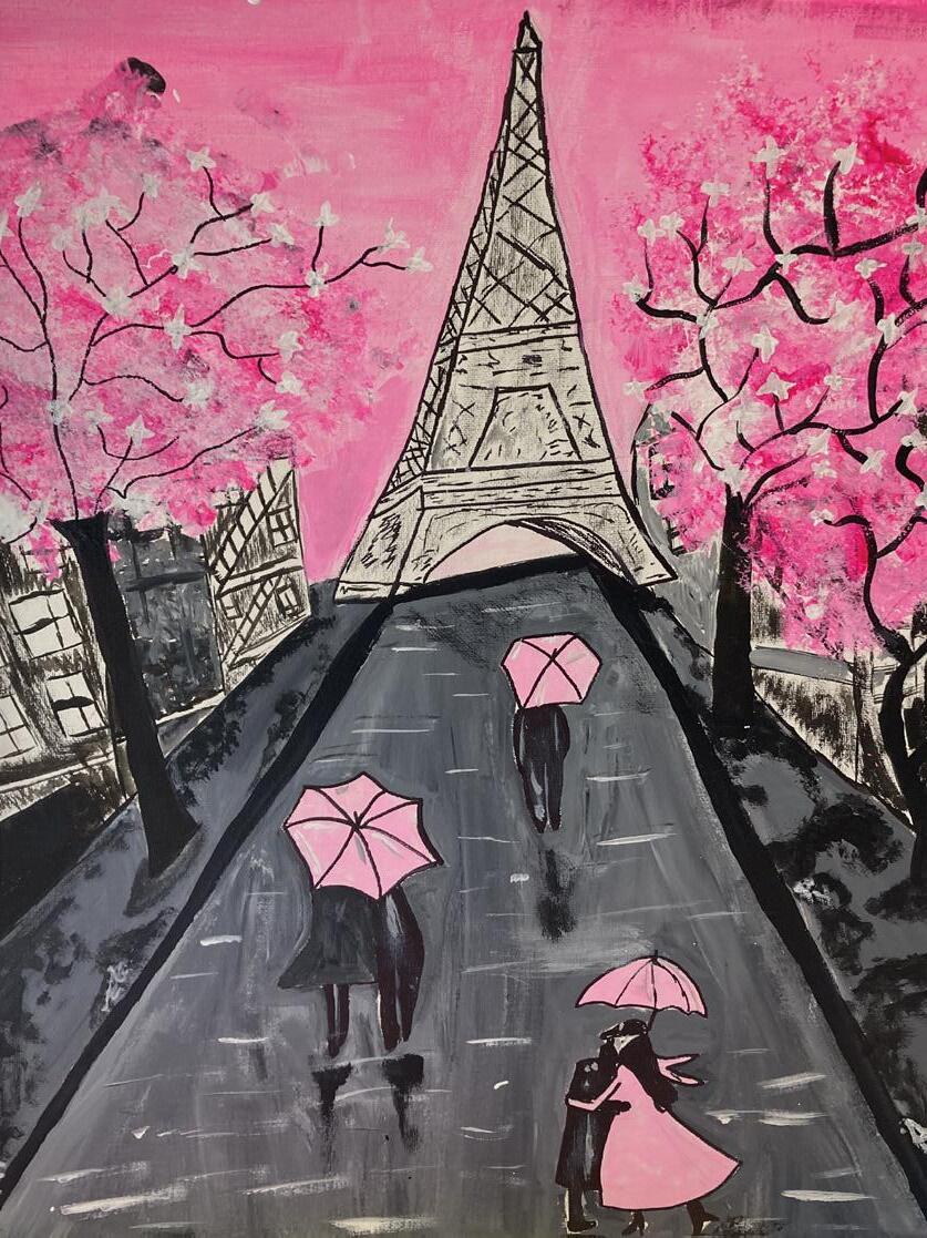 |6. This beautiful painting of Paris was rendered using acrylics by Chloe Bowles '25. |7. The beauty of American film icon Audrey Hepburn is captured in this monochromatic portrait by Anna Edwards '22. |8. At the end of the production Joyland, 5th grade students take a bow. |9. University of Mount Olive’s premiere acapella group, Carolina Sound, captivates the Lower School students in worship. |10. The allure of wildlife is showcased in this nature painting of a deer by Leelee Votaw '24.