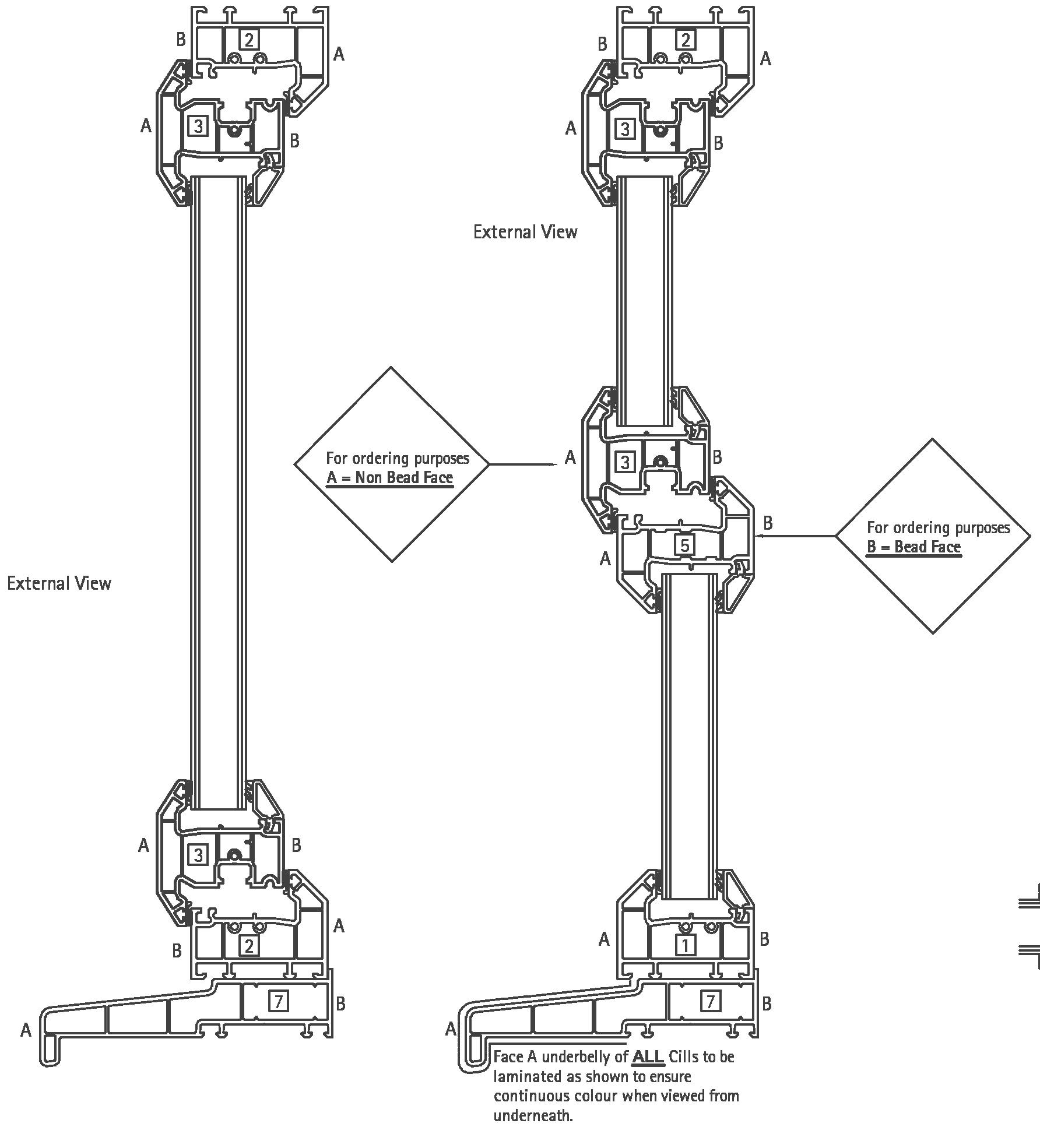 Face A underbelly of ALL cills to be laminated as shown to ensure continuous colour when viewed from underneath.