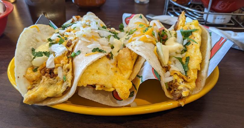 6 pages, including a full page of various omelets - both American flavors and Mexican Fiesta omelets with specialty flavors. Next up are waffles, pancakes, and French toast in every conceivable combination. ‘Yankee Breakfasts’ are available with a variety of egg, meat, and toast variations, including sausage gravy and cream chipped beef. For the light breakfast there is fresh fruit, muffins, and oatmeal. Another page of breakfast quesadillas, enchiladas, fajitas, and tacos awaits your desire to try a new breakfast taste sensation. The Huevos Rancheros is a specialty and one of the most asked for items on the menu.