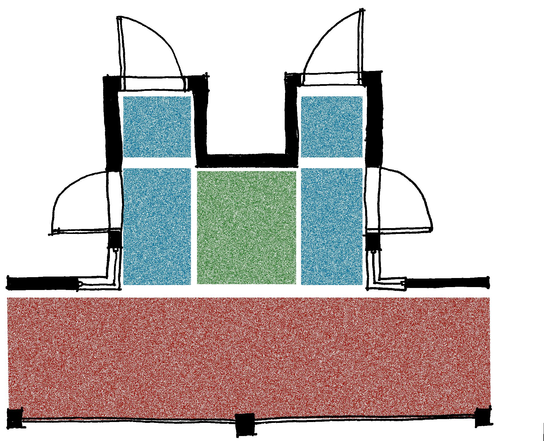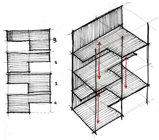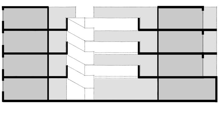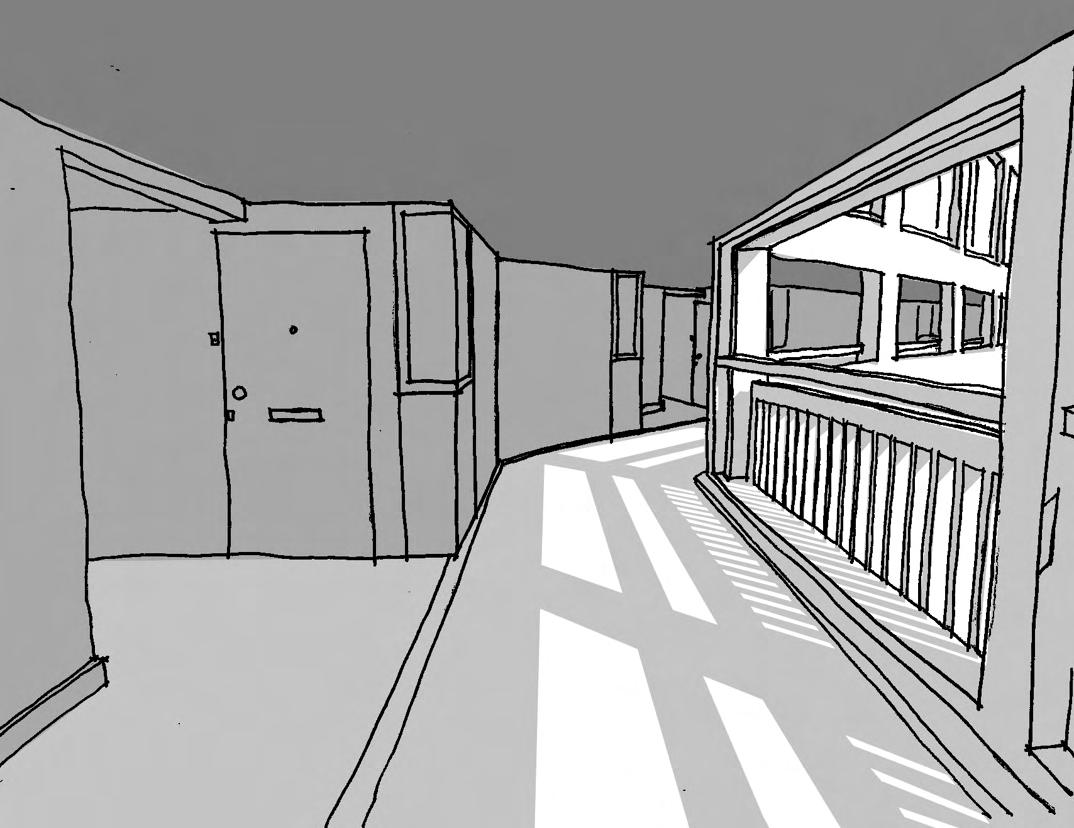 The study drawing above depicts the ‘streets in the sky’ and the ‘porches’. The architectural form creates a divide between the circulation space and porch space. This is highlighted by a linear drain on the floor and more noticeably, by shading. Each deck casts a shadow on the porches below, but the decks remain lit. This draws people towards the edge and away from the more private porch spaces.