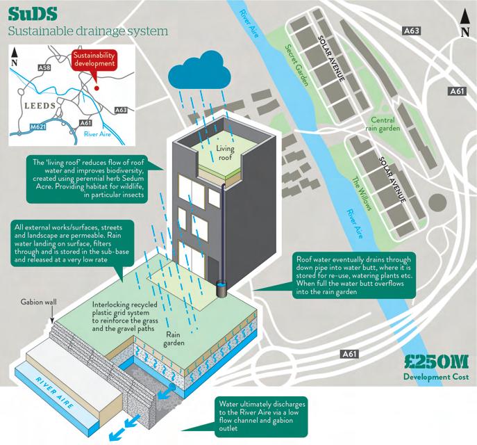 The majority of the ground, and even the roofs, are used as a rain garden or are covered with permeable paving. It is a prime example of where sustainable urban drainage solutions are used effectively.
