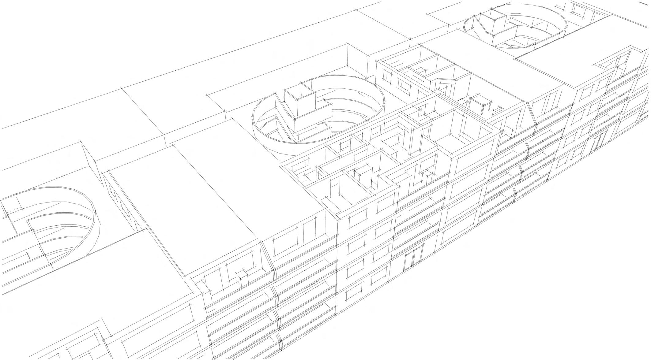 In Part 2.4 I identified the need for versatility in my design so it could be applied to similar sites. This is achieved by dividing the master plan into blocks. Any number of these blocks can be placed next to each other to form a neighbourhood with unbroken access from one side to the other. Each block functions on its own, featuring front, back, and side entrances, a courtyard, stair and lift core, 3 access decks, and recycling and laundry facilities. A small communal area is provided for the residents, encouraging a community to be formed within the block in addition to the neighbourhood as a whole. Each block contains 22 flats, ranging from one to four bedrooms.