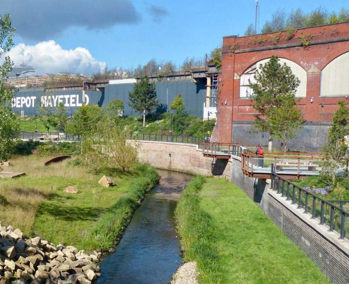 This scheme in Leeds uses careful layering of landscaping materials to slow the movement of rainwater into the river to prevent flooding.
