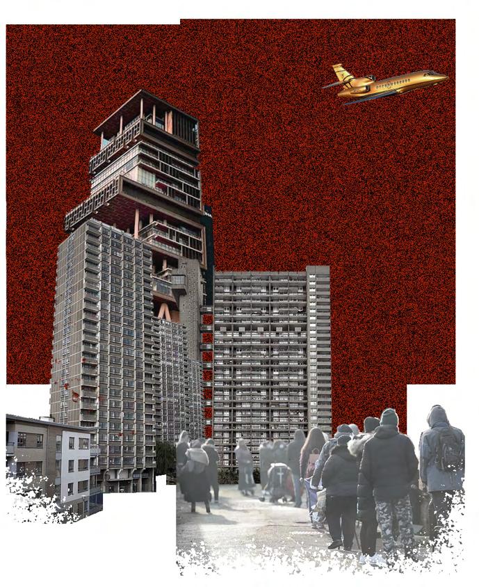 The collage above features Antilla, Mumbai - the private residence of a billionaire that is situated near several slum areas. It is a symbol of gross inequalities in cities. This contrasts with the foreground, depicting 1970s social housing blocks and a queue for a food bank. The background is reminiscent of my urban grain study - recognising how access to basic needs is restricted as a result of privatisation.