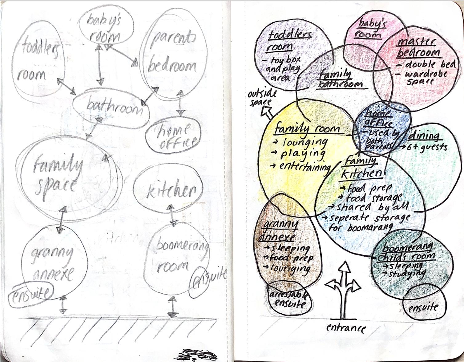 I carefully considered how each family member would spend their time the house and graphically represented it in furniture. I provided larger larger bathroom facilities for the Grandad to assist with his declining mobility. I also provided each child with space for a double bed to ensure their bedrooms would be sufficient when they grow up.