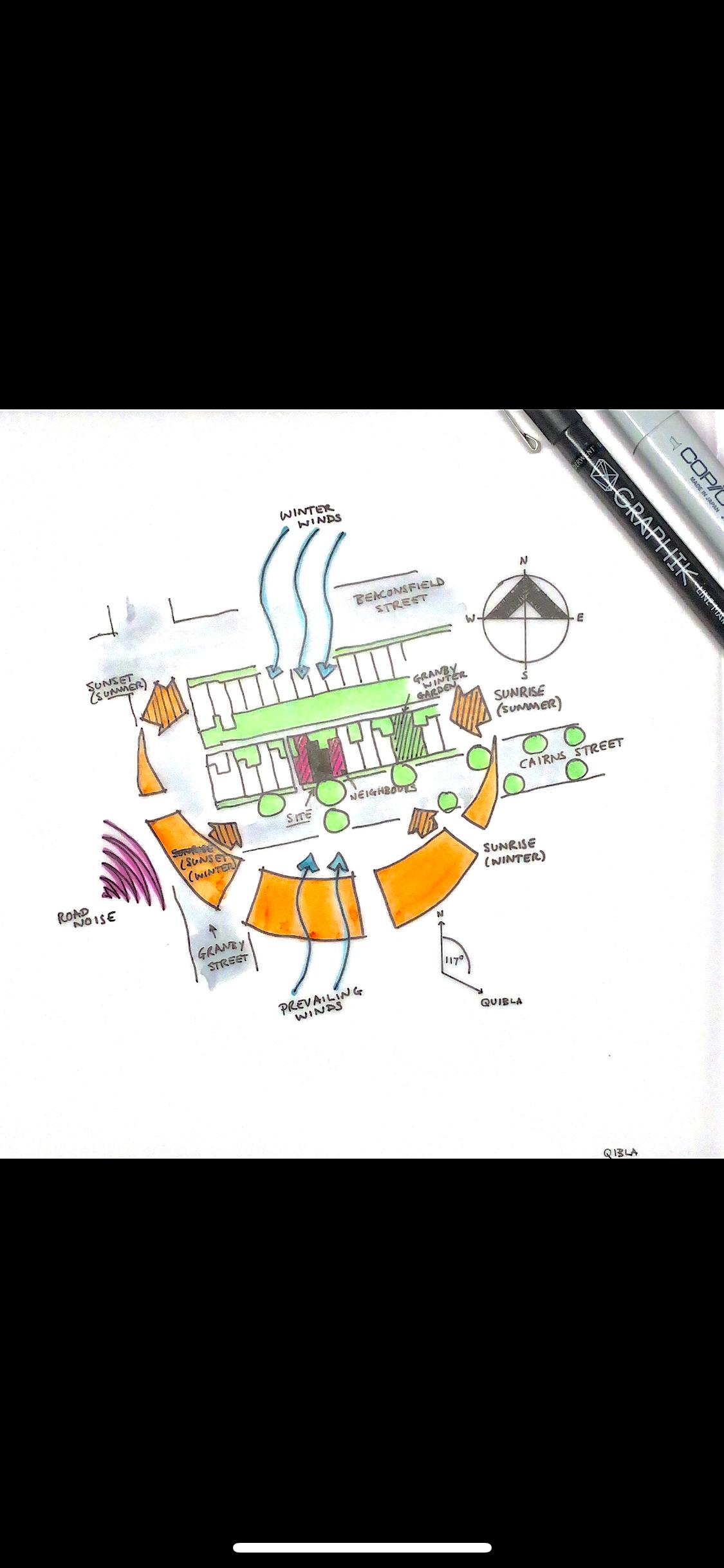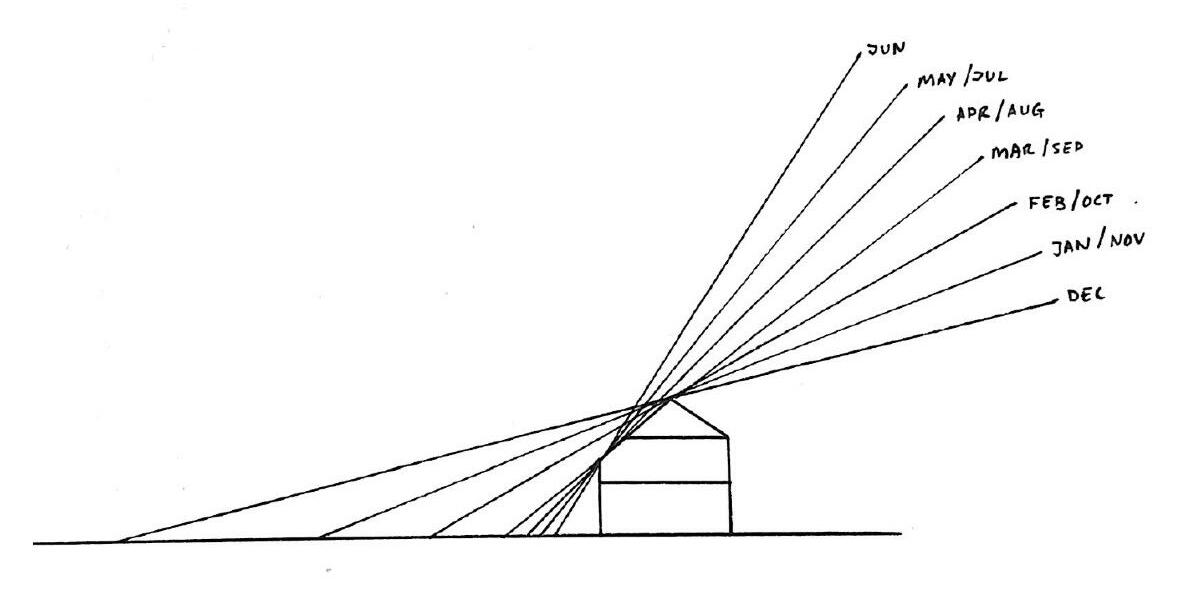 Sun path analysis shows how the front of the house receives the most sunlight. The angle of the site plot means it also receives evening light, whereas the rear of the house receives morning light.