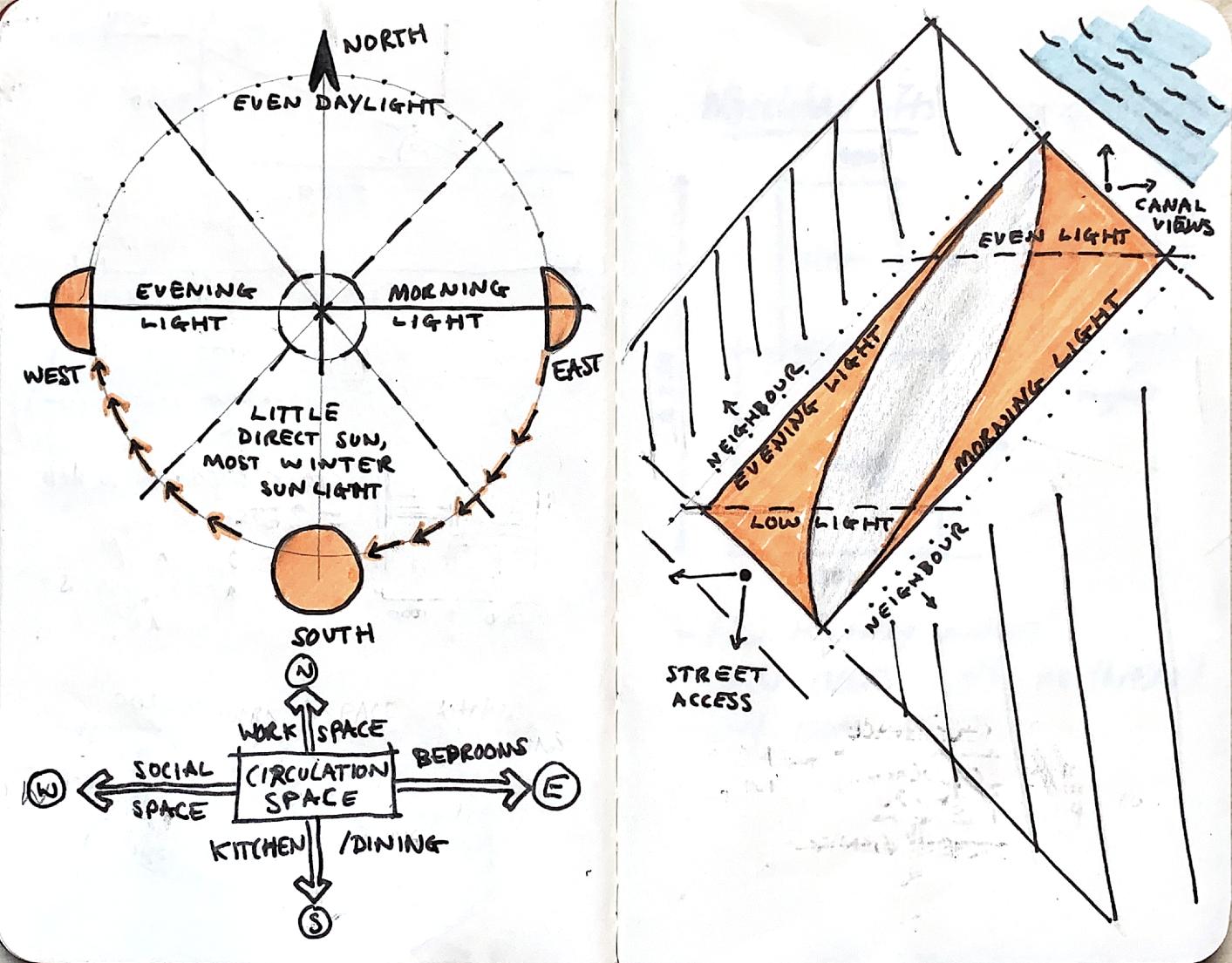 The orientation of the site means the garden is in almost constant shade throughout the year and direct sunlight only hits the the rear pitch of the roof from April to August. Therefore the front facade may have to be adapted to maximise direct sunlight into the house.