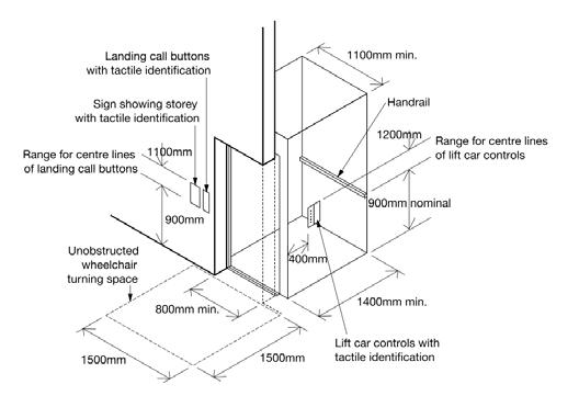 As per provision 3.28 a, there is an unobstructed manouvering space of 1500mm x 1500mm in front of each lift.