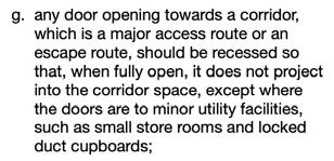 Because the walkways are part of major access routes and emergency escape routes, all doors used by the general public open away from it to prevent obstuctions when open. The only doors that open into the walkways are those used for minor utility functions and are kept locked in accordance with provision 3.14 g.