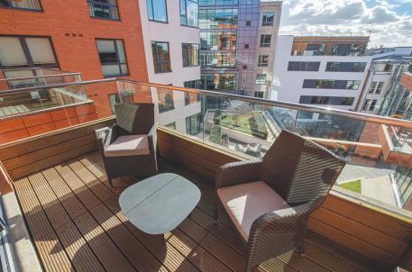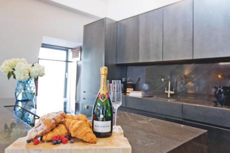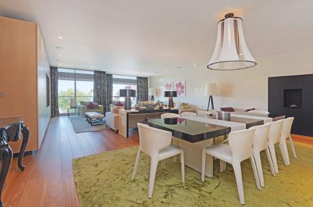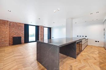 A spacious three-bedroom riverside apartment with an open-plan living room and a fully equipped high-spec kitchen, plus access to a spa, pool and gym.