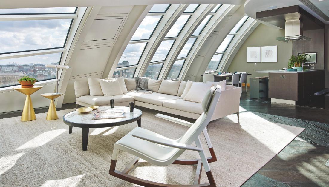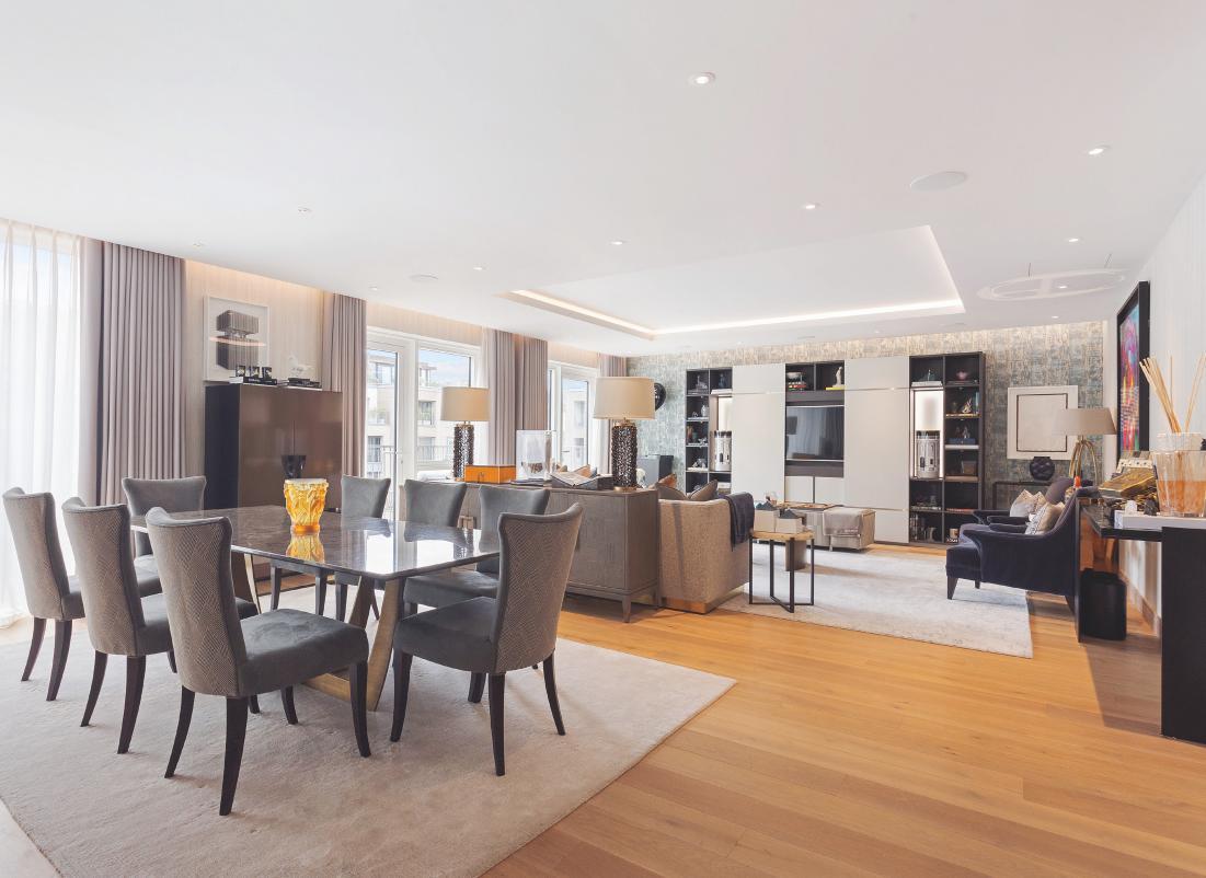 A chic three-bedroom apartment in Vauxhall, in the UK’s tallest residential building, complete with sports and leisure facilities, not least a pool with river views.