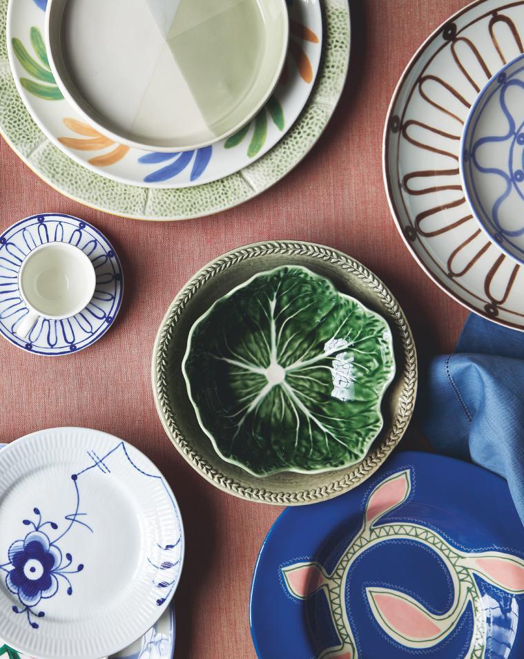This page, clockwise from top left Bordallo Pinheiro Melon serving plate £53.95; Themis Z Gaia dinner plate £65; Soho Home Melrose pasta bowl £125 for set of four; Alexandre Turpault linen tablecloth £229; Themis Z Kyma dinner plate £65 and Serenity dessert plate £58.95; Alexandre Turpault Florence napkin £27.95; Laetitia Rouget Dancing Queen dinner plate £400 for set of four, mixed designs; Themis Z Serenity charger plate £102; Royal Copenhagen Blue Fluted Mega Plate £70; Themis Z Symi dessert plate £63 ( just visible, bottom left), and Kyma espresso cup and saucer £79.95; Soho Home Hillcrest pasta bowl £125 for set of four; Bordallo Pinheiro Cabbage bowl £20.95.