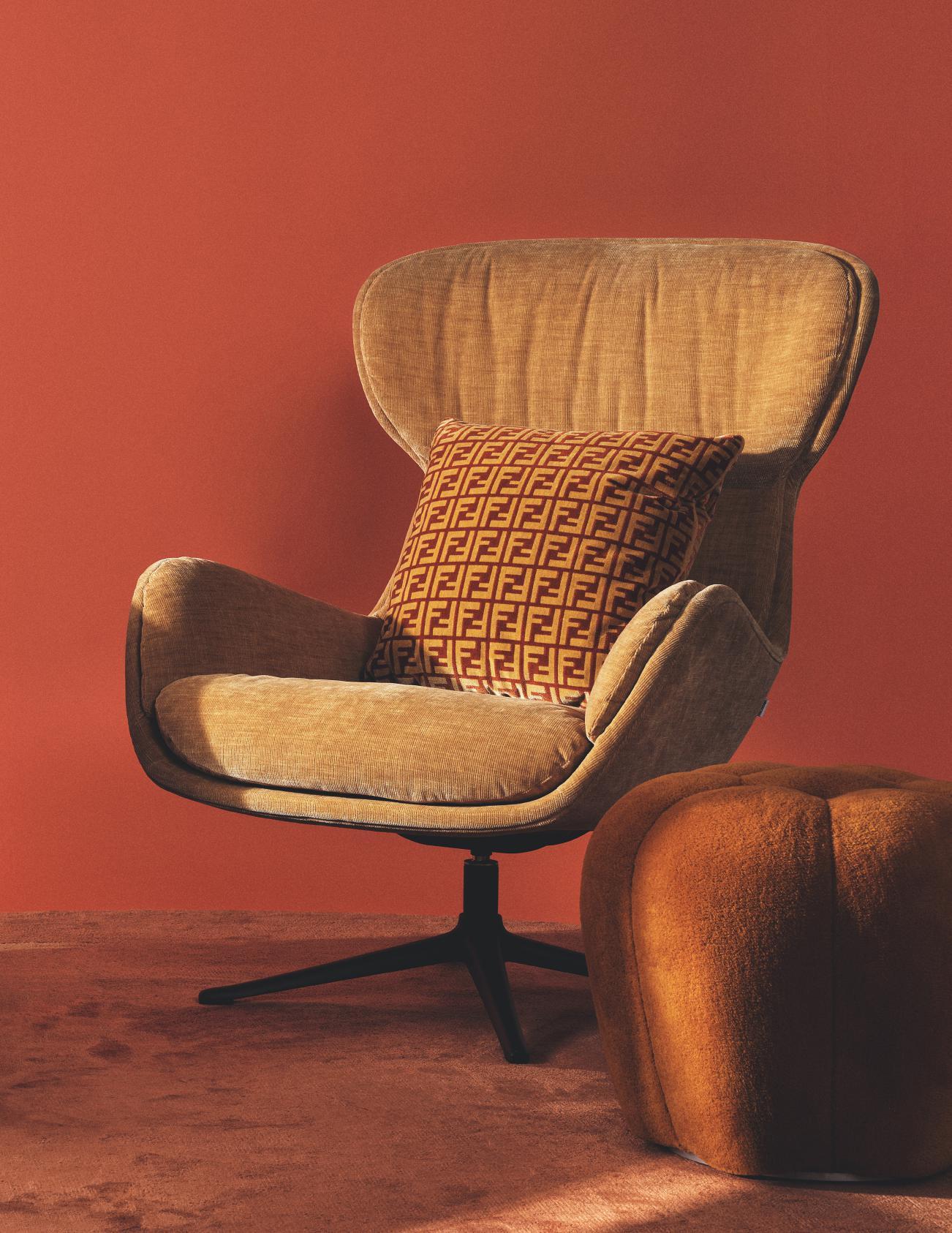 Furniture, from left Fendi Casa Bottini Jelly side table £7,280; Roche Bobois Dot armchair £2,330; BoConcept Reno chair £2,479; Roche Bobois Apex ottoman £860; accessories and homewares Fendi Casa Yellow Sign rug £16,330 and FF cushion £760; Roche Bobois Tribu jar