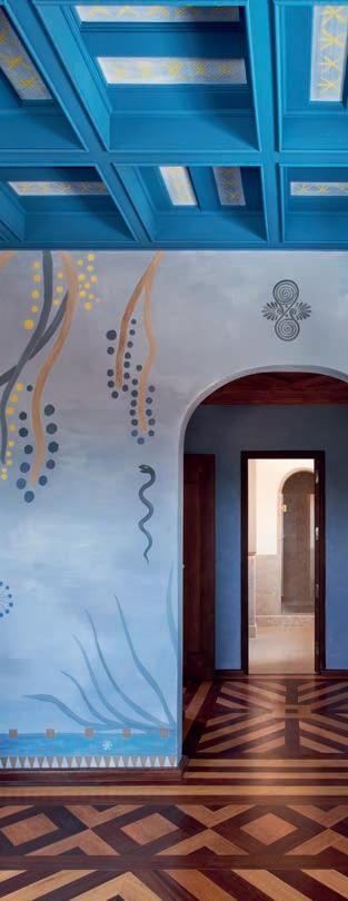 A bedroom in Christian Louboutin’s Vermelho hotel in Portugal, featuring a fresco by Greek artist Konstantin Kakanias