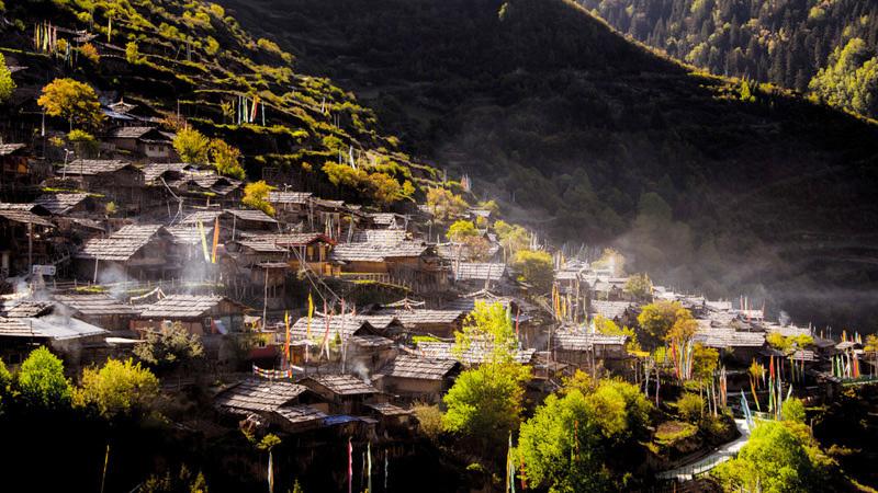 ⼤录古藏寨,流光岁⽉在这个⼩村缕缕炊烟中淡化消逝,古寨的神韵, 在烟熏雾绕中⽇积⽉累。⼟墙、⽊⽡和圆⽊组合的藏家⼩屋,错落有致地占 据着⼭坡上珍贵的平整地形,坚强⽀撑着古寨久远的历史,追忆古寨曾经的 恢弘。寄居在⼭坡古寨的⼈家,朝迎寒露晚接⻛,承联古庙的灵⽓。