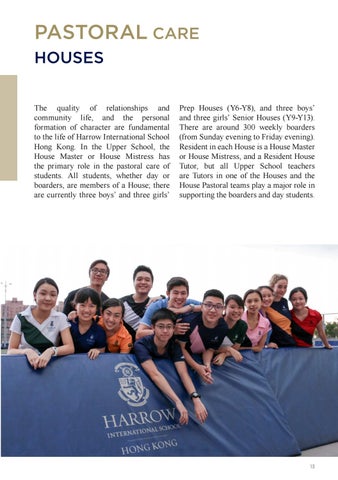 PASTORAL CARE HOUSES The quality of relationships and community life, and the personal formation of character are fundamental to the life of Harrow International School Hong Kong. In the Upper School, the House Master or House Mistress has the primary role in the pastoral care of students. All students, whether day or boarders, are members of a House; there are currently three boys’ and three girls’