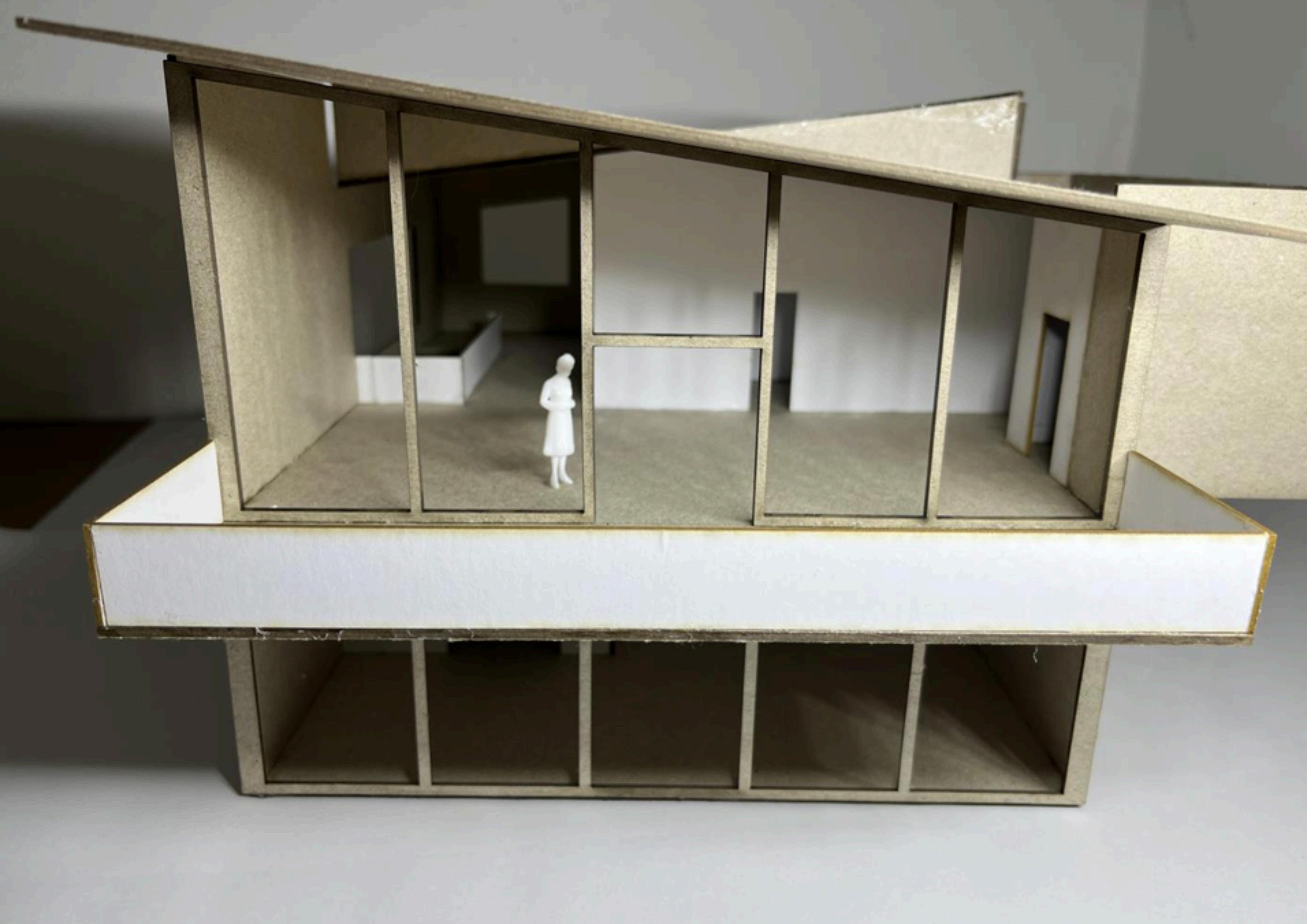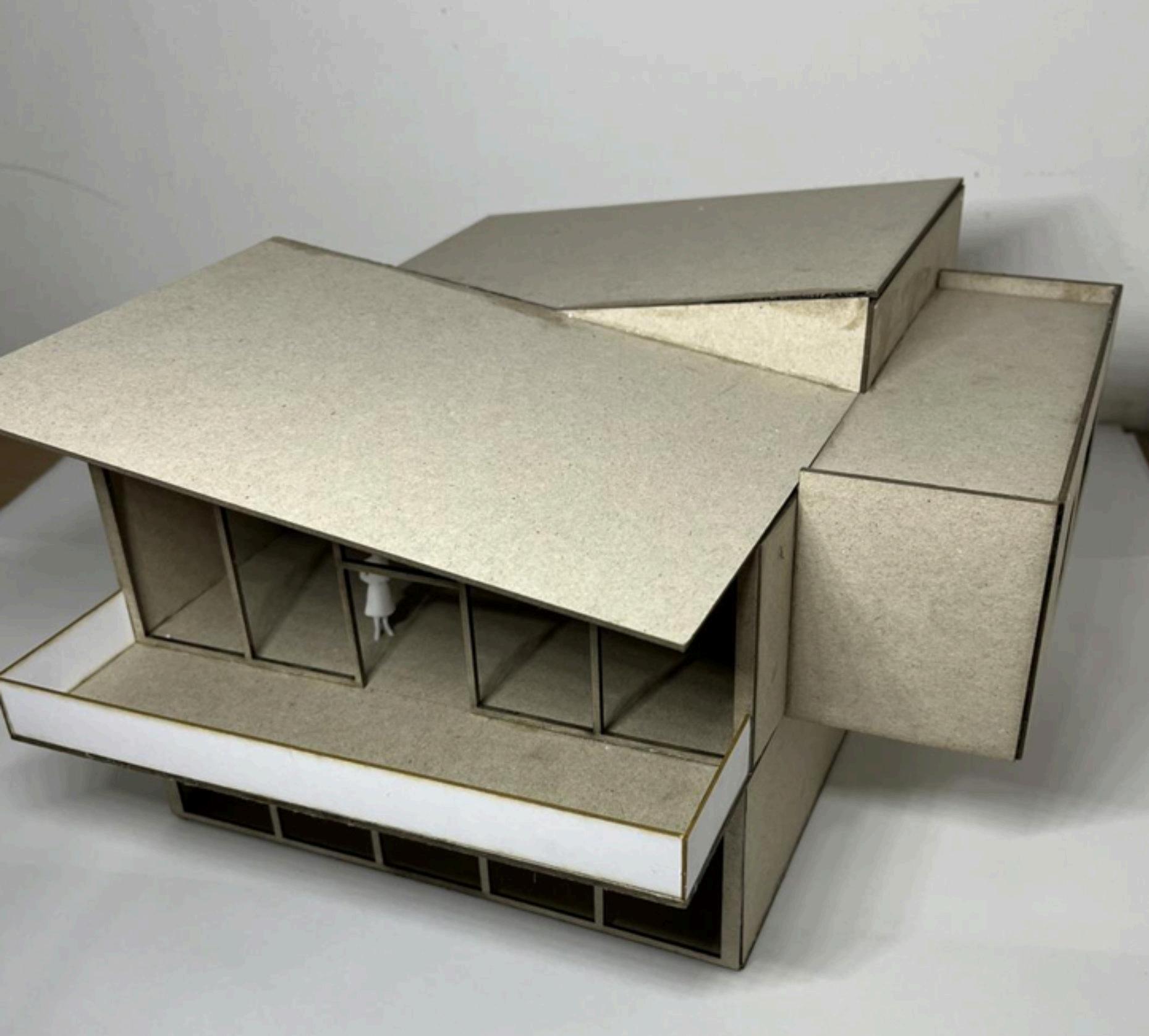 The developement of the curved shape was to be able to have two defining spaces that are linked but also serve individual functions. The roof panels were two rectangular slabs to contrast the curved ewall shape, held up by columns.