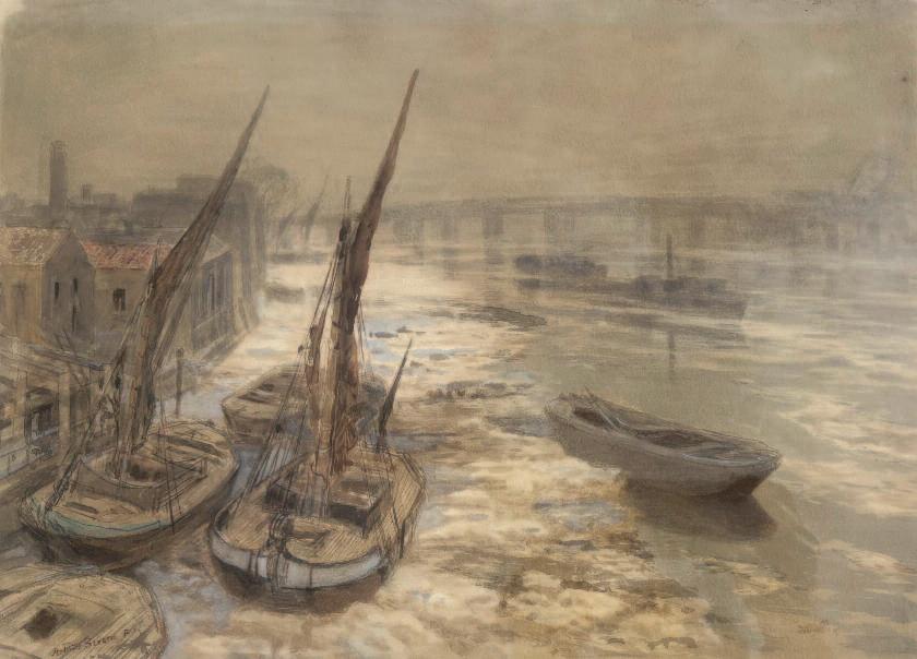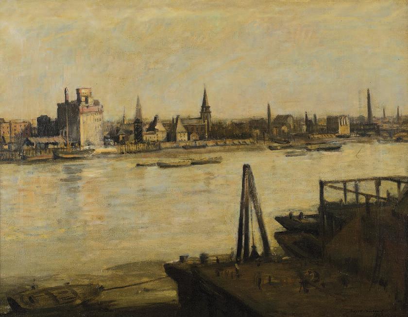 Muirhead lived on Cheyne Walk and executed a number of atmospheric views of the nearby Thames which show the clear influence of his neighbour there J.M.Whistler, whom he had known as a fellow member of the New English Art Club At least two known paintings of Battersea Reach by Murihead exist from 1917, the present work and another slightly larger version viewed from a lower vantage point on the river, which was presented to the Tate Gallery in 1918 through the National Art Collections Fund (inv.3323). That work was also exhibited at the New English Art Club in the summer of 1917 (no 94)