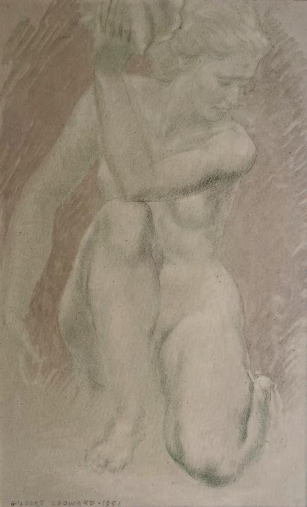 The present work is a study for Ledward’s bronze nymph on the Venus Fountain (1952-3) standing in the centre of Sloane Square, Chelsea Sketches relating to this fountain were exhibited at the Royal Academy in 1953 and 1954 The fountain was paid for by the Leighton Fund which had been set up by Lord Leighton’s sisters for the purpose of placing works of art in or near public buildings. The inscription beneath the rim of the vase reads: Thames Run Softly till I End My Song..