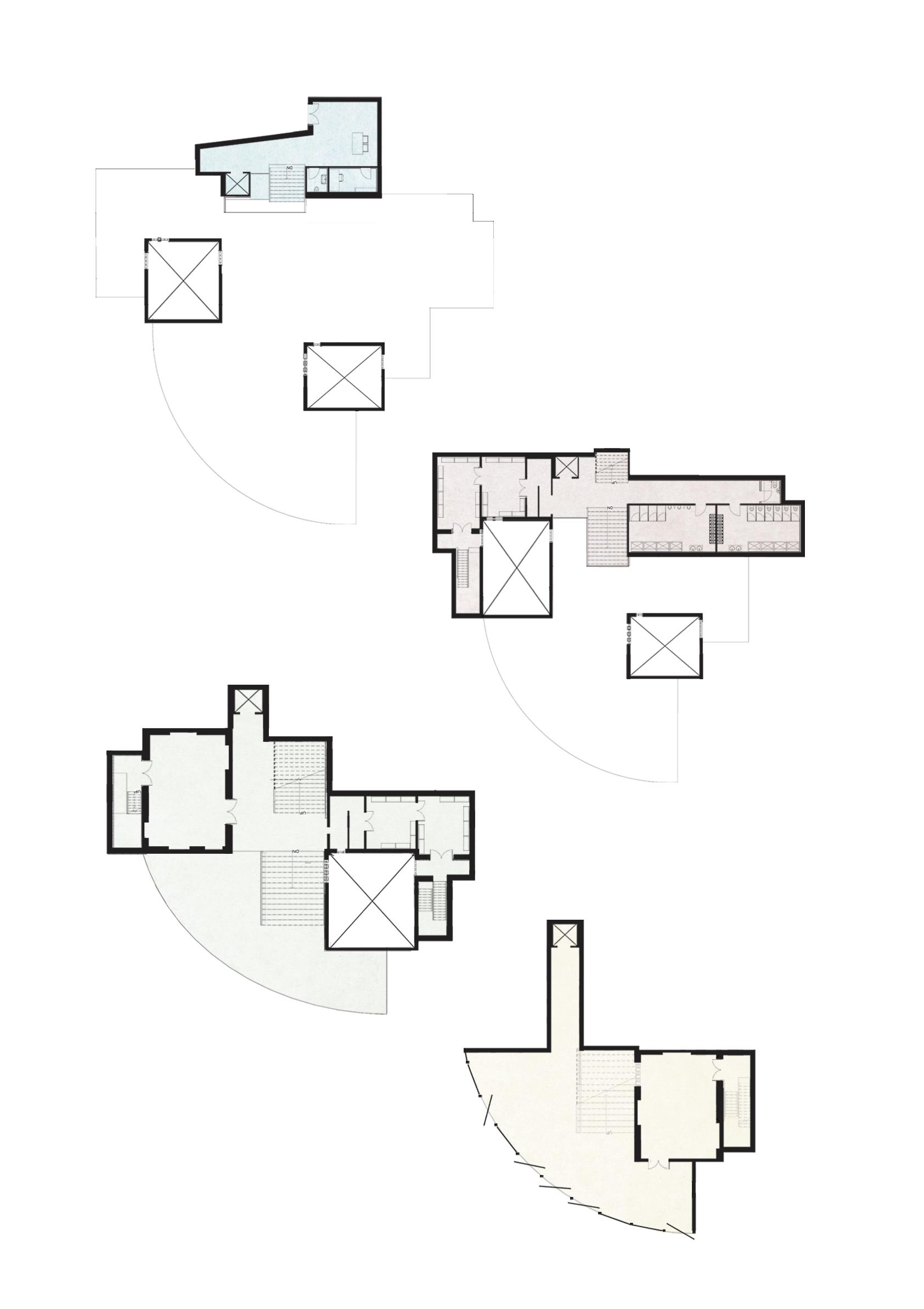 As visitors arrive, the sloped pathway and low ceiling create a sense of mystery, o ering only a limited view from the third oor. However, as they follow the terrain downward, a breathtaking sea view gradually unfolds. This carefully designed sequence enhances the experience, evoking a sense of exploration as visitors navigate the building.