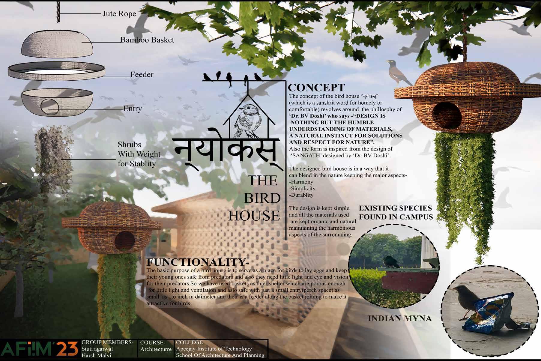 Nyokas, harmonious birdhouse, inspired by the philosophy of B.V. Doshi and crafted with organic, natural materials. This ethereal abode for feathered friends is a testament to Doshi’s belief in sustainable living and the interconnectedness of nature. Made entirely from renewable resources , this birdhouse blends seamlessly into its surroundings, providing a safe haven for birds while preserving the environment. The design embodies Doshi’s organic approach, with flowing lines, gentle curves, and earthy tones. Every aspect, from the nesting chambers to the perch, emanates a sense of balance, creating a tranquil refuge in tune with the natural world.