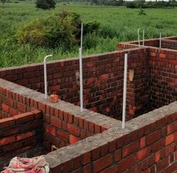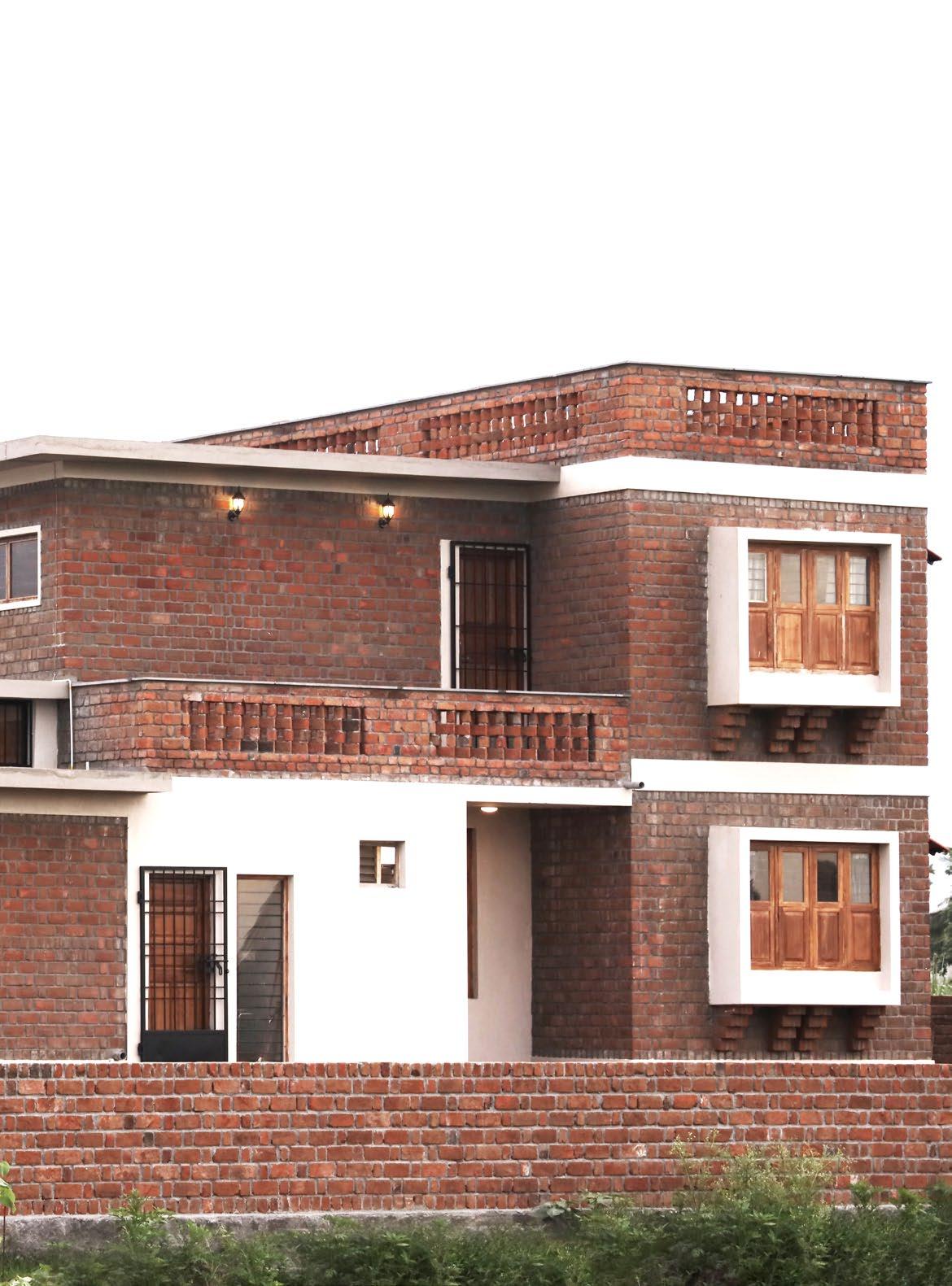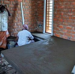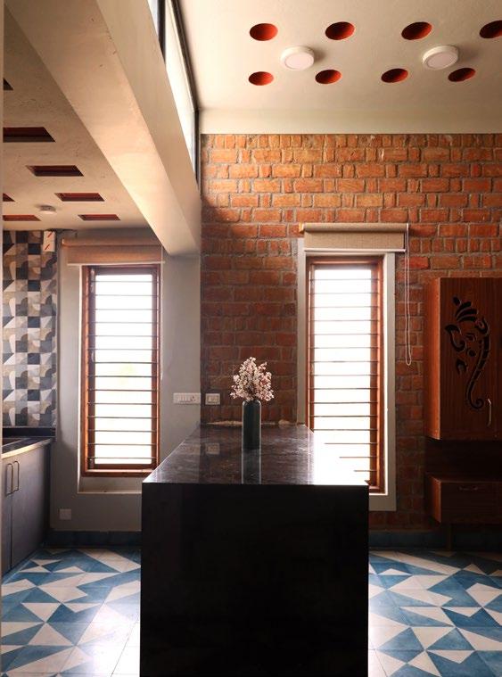 Working within a tight budget, the project emphasized ecological sensitivity through the use of reclaimed materials, low-embodiedenergy construction, and passive design strategies. Materials were recovered from onsite demolitions and sourced within an eightmile radius, including rubble stones, reclaimed teak doors and windows, handmade bricks, and Athangudi tiles. Construction techniques took inspiration from British-Indian Architect Laurie Baker ’s principles, using load-bearing walls, rat-trap bond masonry, and filler slab roofing with terracotta pots and reclaimed Mangalore tiles.