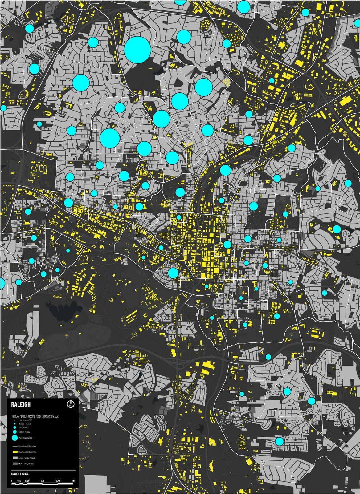 This map plots median annual income as blue circles overlaid on single- and multi-family parcels, shown in light and dark grey fills respectively, in Raleigh. Block group boundaries are outlined in white, and commercial buildings are highlighted in bright yellow to help identify downtown Raleigh