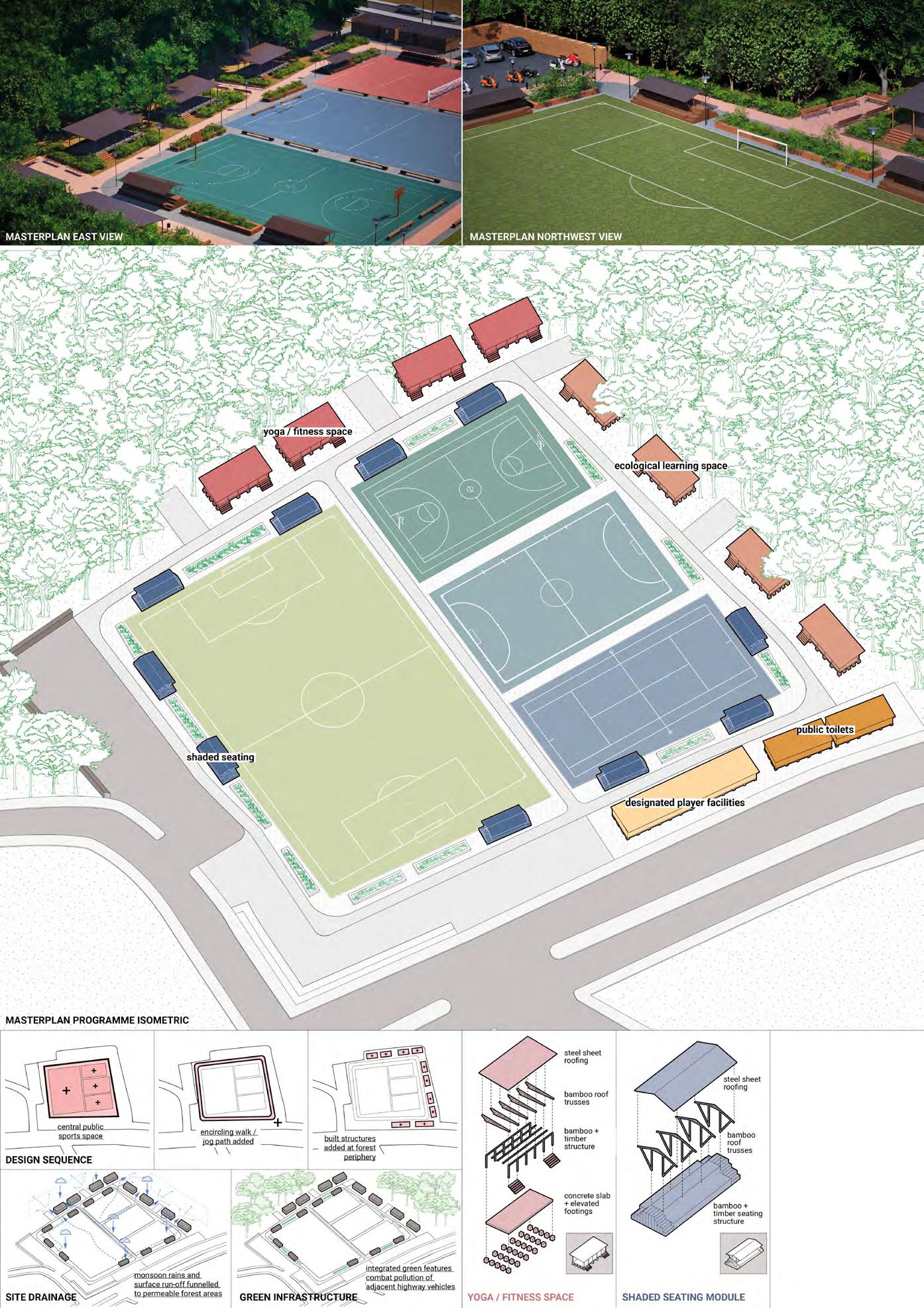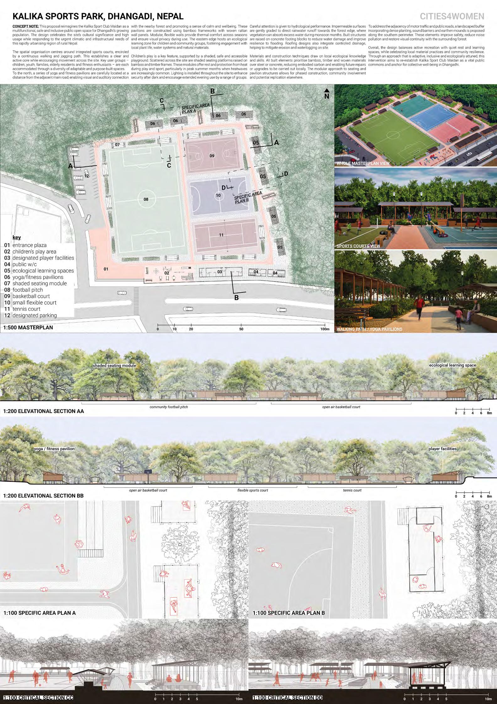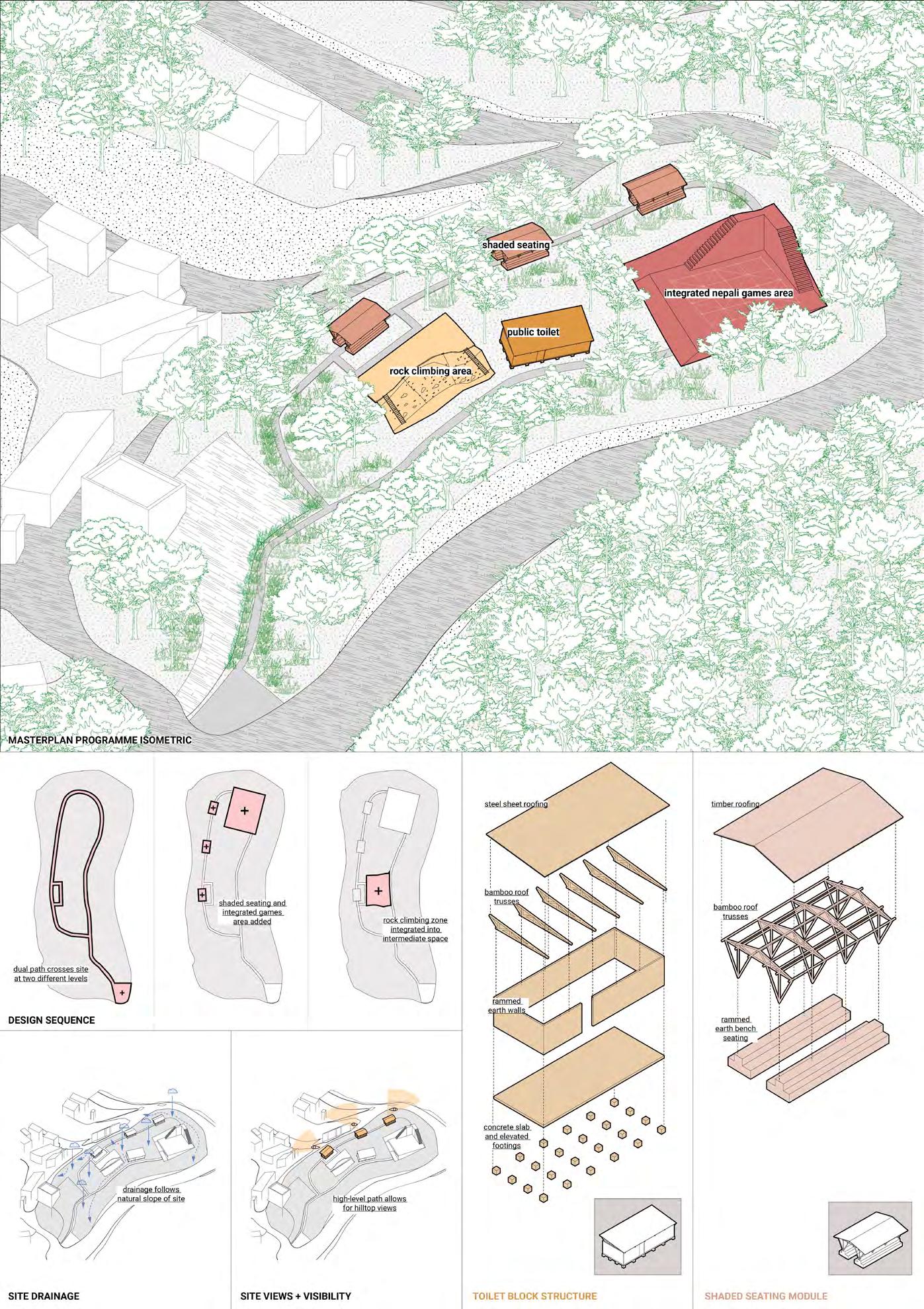 Climate-responsive public space designs in Dhangadhi, Birendranagar and Chandragiri, each tailored to local environmental conditions, terrain and community use. In Dhangadhi, Kalika Sport Club Maidan is restructured around central sports courts with a jogging path, children’s play area, yoga spaces, and ecological learning zones. Structures are built using bamboo and timber, elevated on concrete bases to reduce flood risk. In Birendranagar, a sloped site is adapted through a dual-path system: one route passes a rock-climbing area, while the other leads to shaded seating and a multifunctional games square. Excavated earth is reused for rammed earth benches, paired with bamboo roofs for comfort.