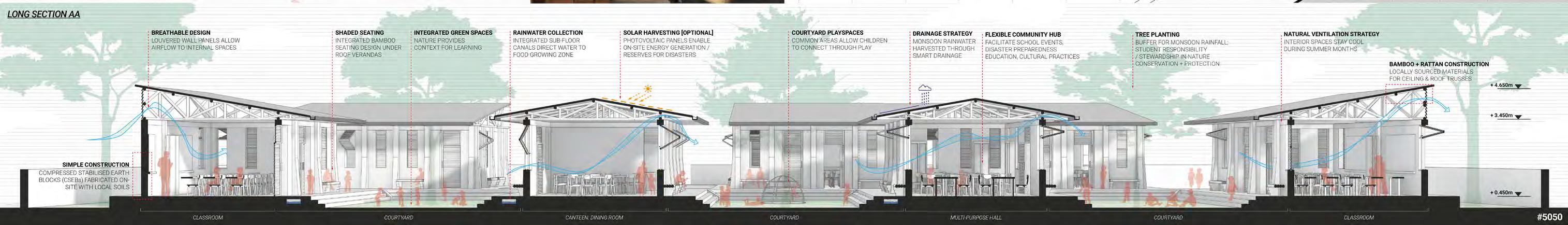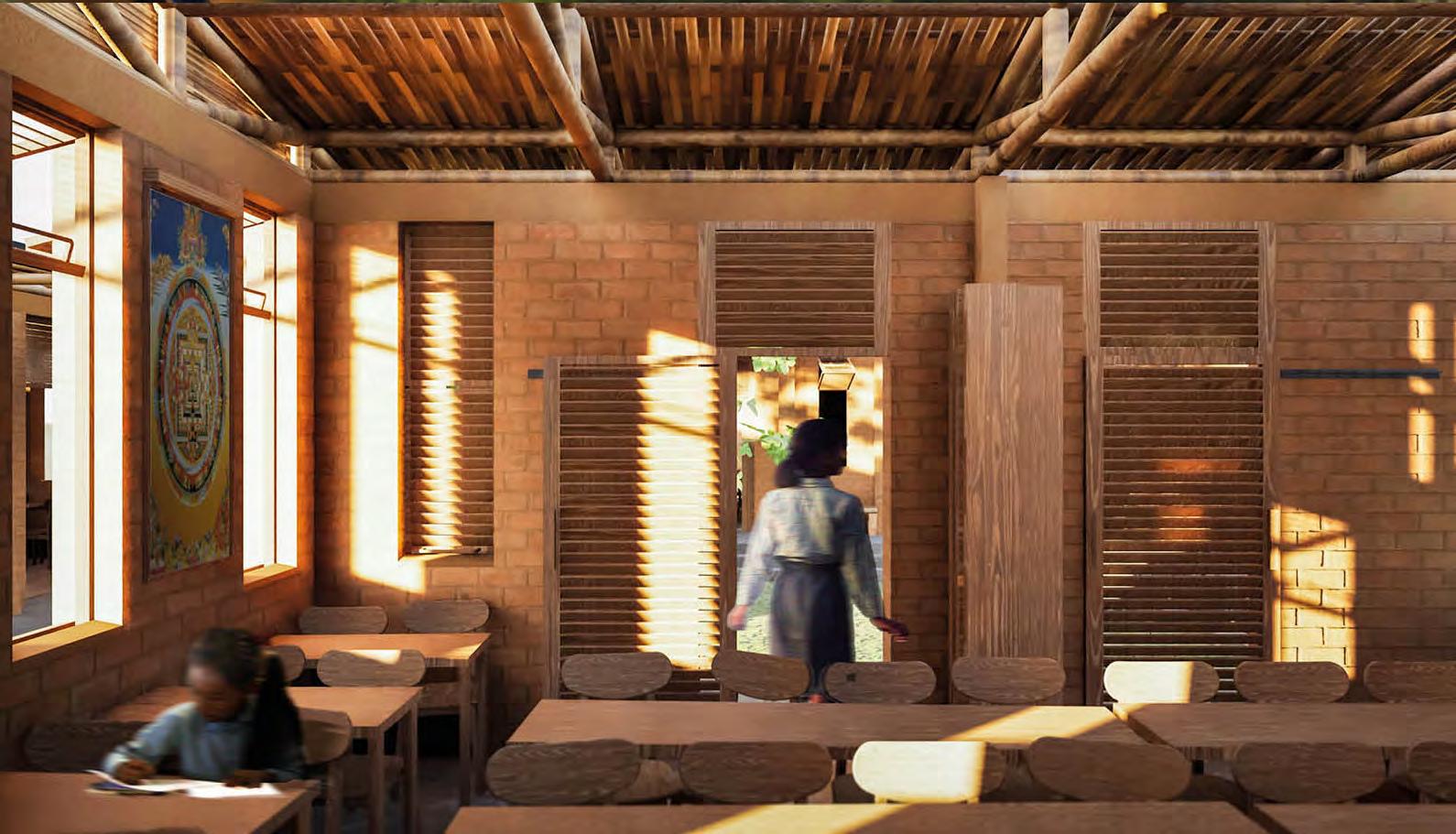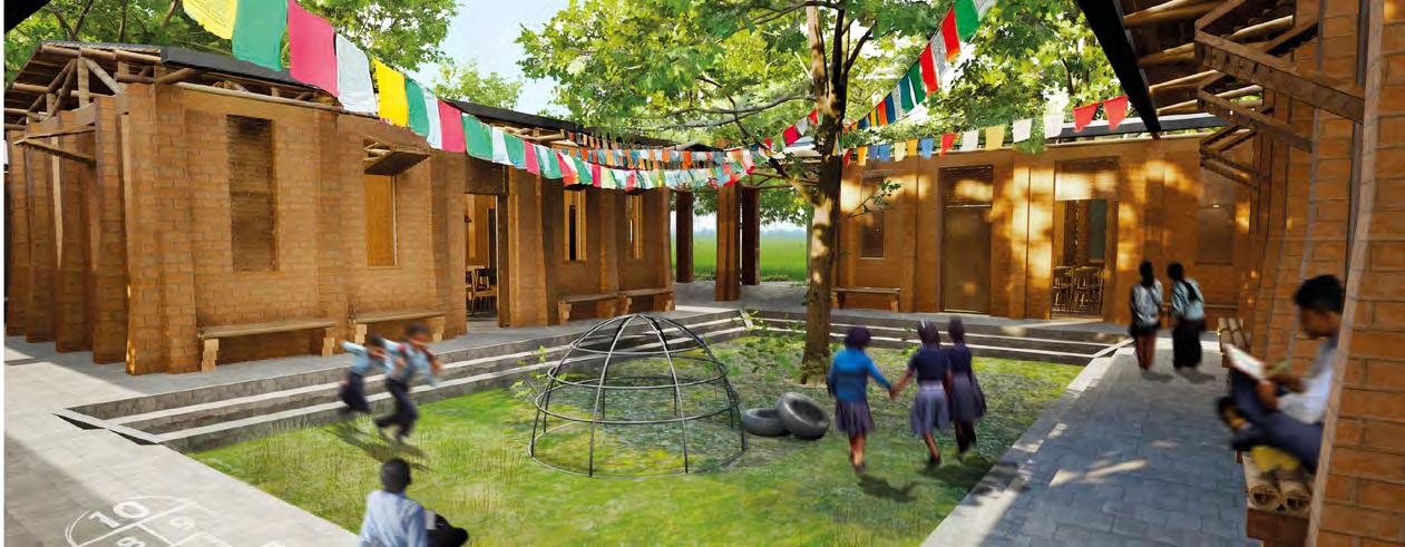Seva School’s incremental concept allows for the gradual expansion of both its programme and its social value to the wider community, as a key asset for disaster resilience and cohesion. The core stage focuses on establishing a primary courtyard space, encircled by classrooms and the central multi-purpose hall. Additional construction of building modules allows the school to expand across the plot, forming more courtyards to accommodate the school’s different ages, as well as adding the canteen and community orchard space – which builds on the school’s potential for bringing local people together through food growing and preparation. The school further expands to add additional classroom capacity, as well as an on-site infirmary that may form an integral part of local health and wellbeing, especially during disasters. The school increasingly looks to serve its local community beyond only providing education, allowing Karmayog Foundation to continue its mission of selfless service (Seva).