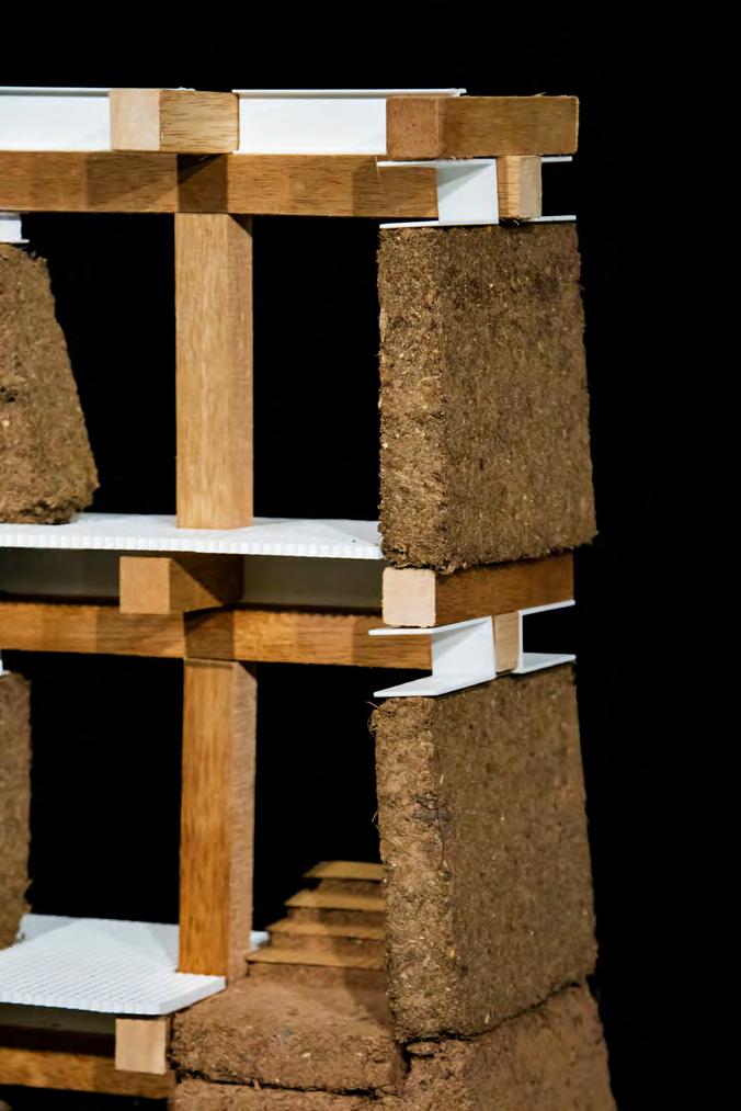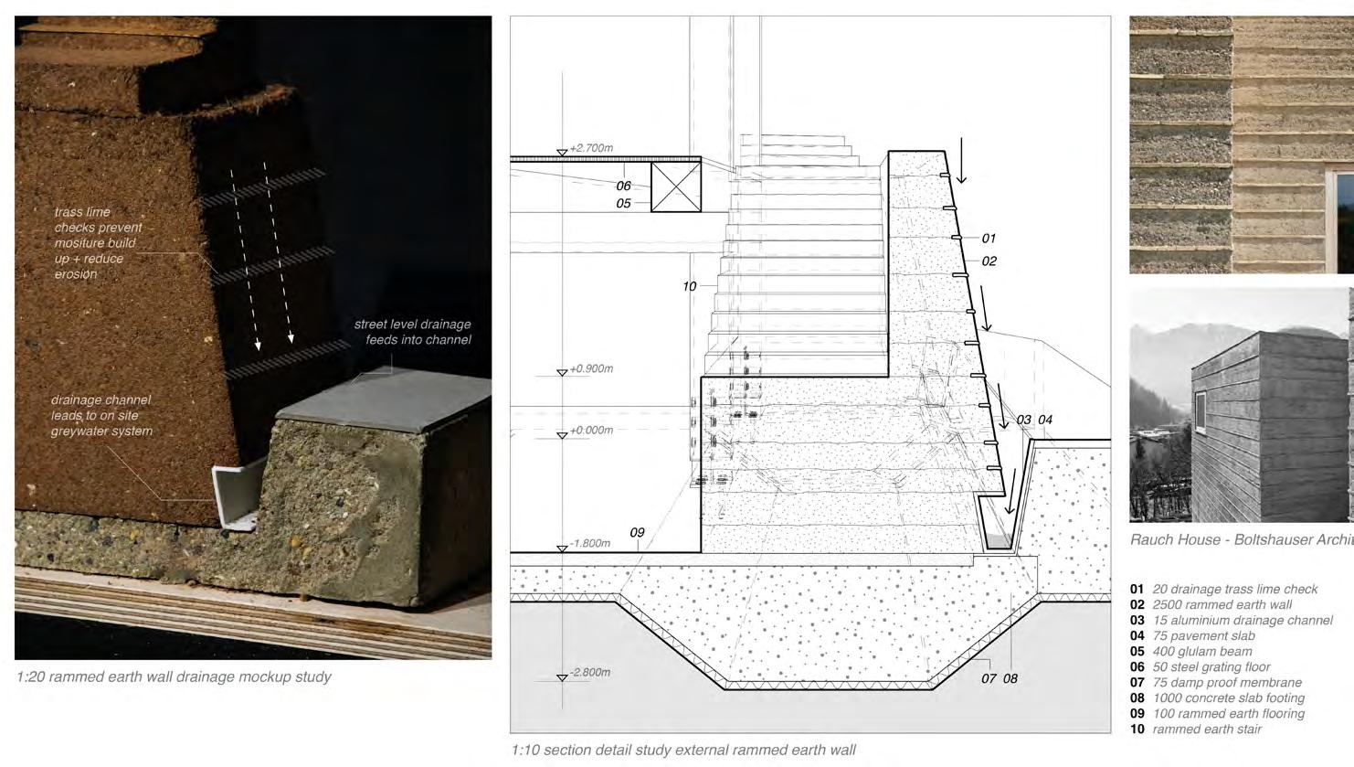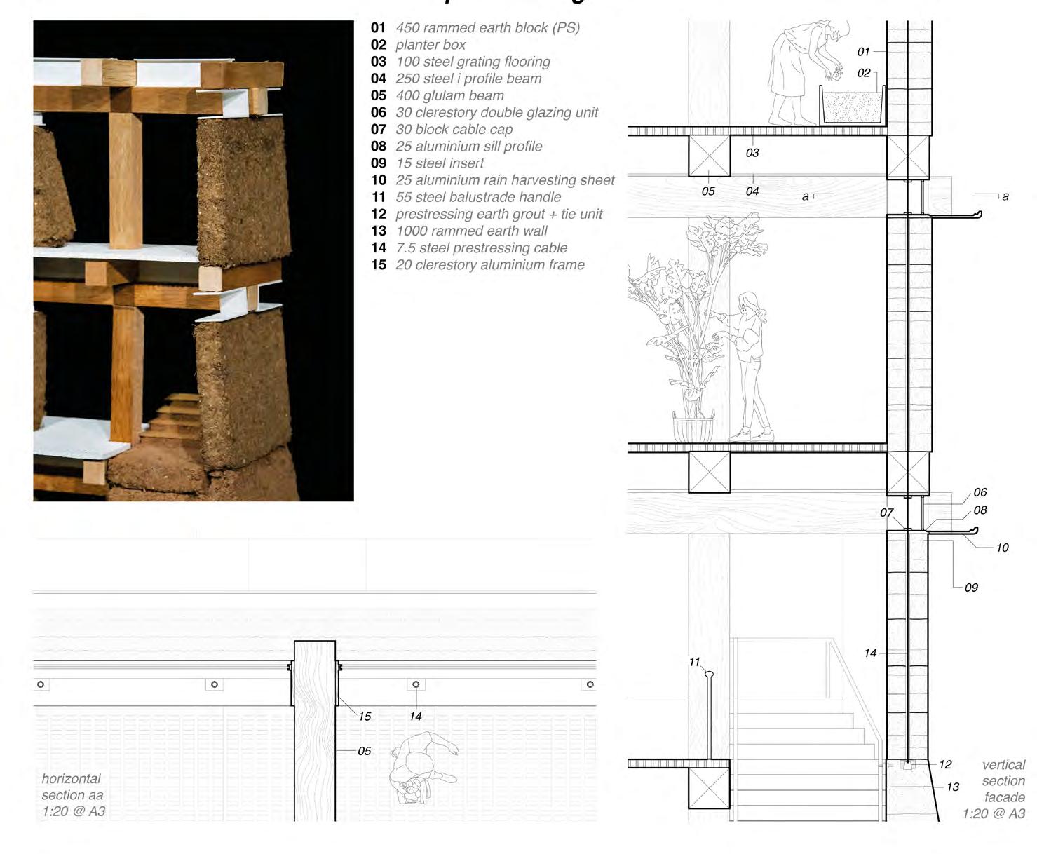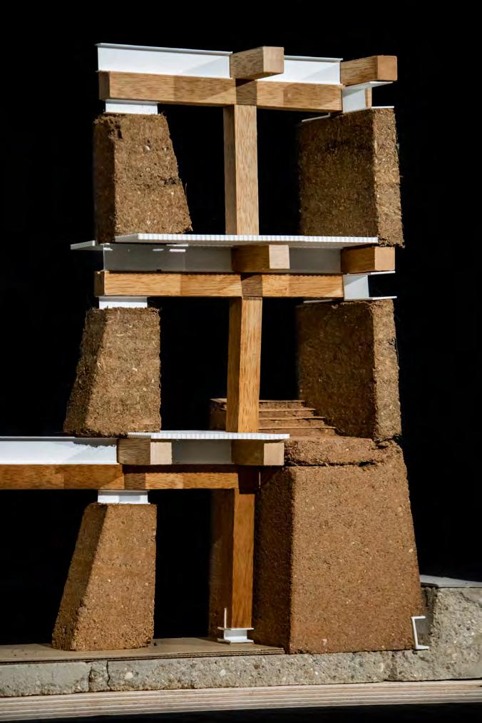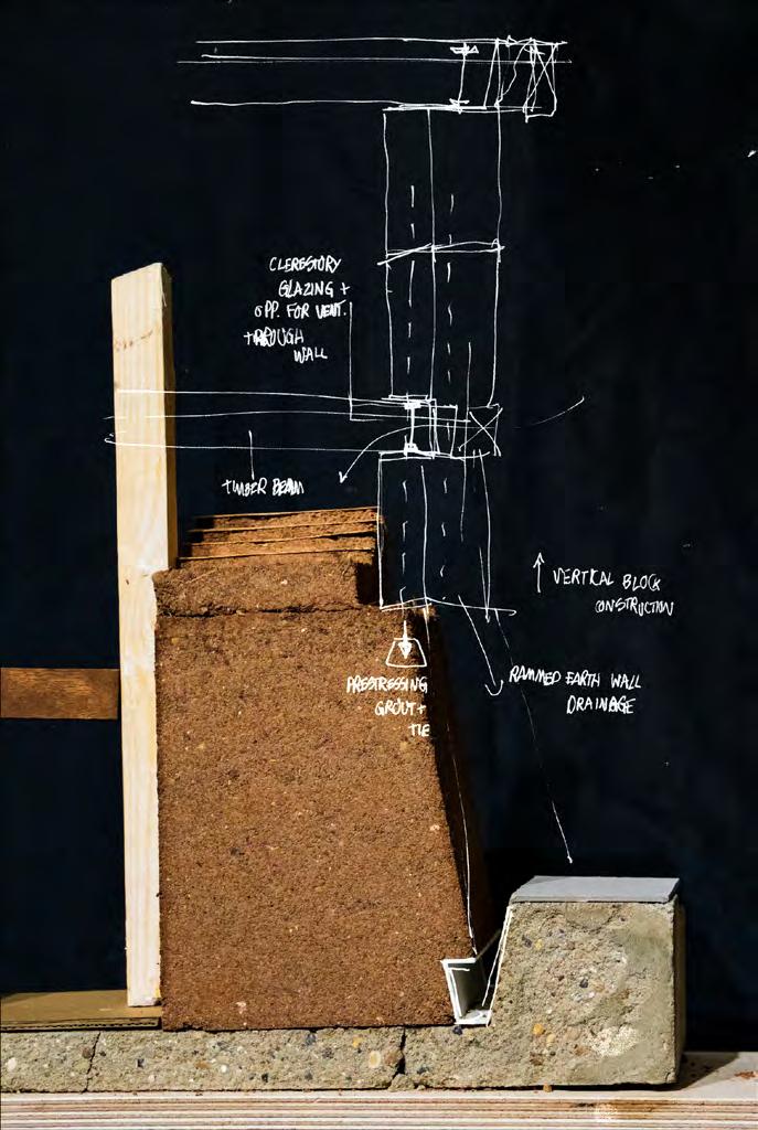 A concurrent technical dissertation focused on the use of rammed earth structural mockups to investigate the feasibility of selfbuild, community-led construction. The physical models tested a variety of floor, wall and facade elements, aiming to demonstrate an intersection between local sourcing, selffabrication and incremental development.