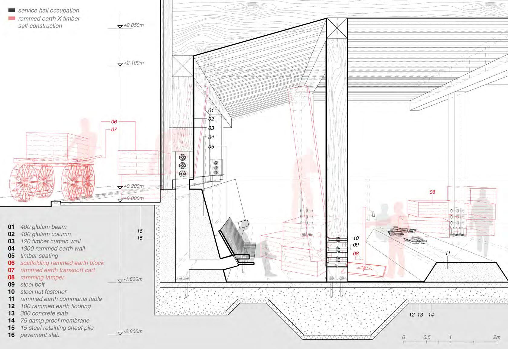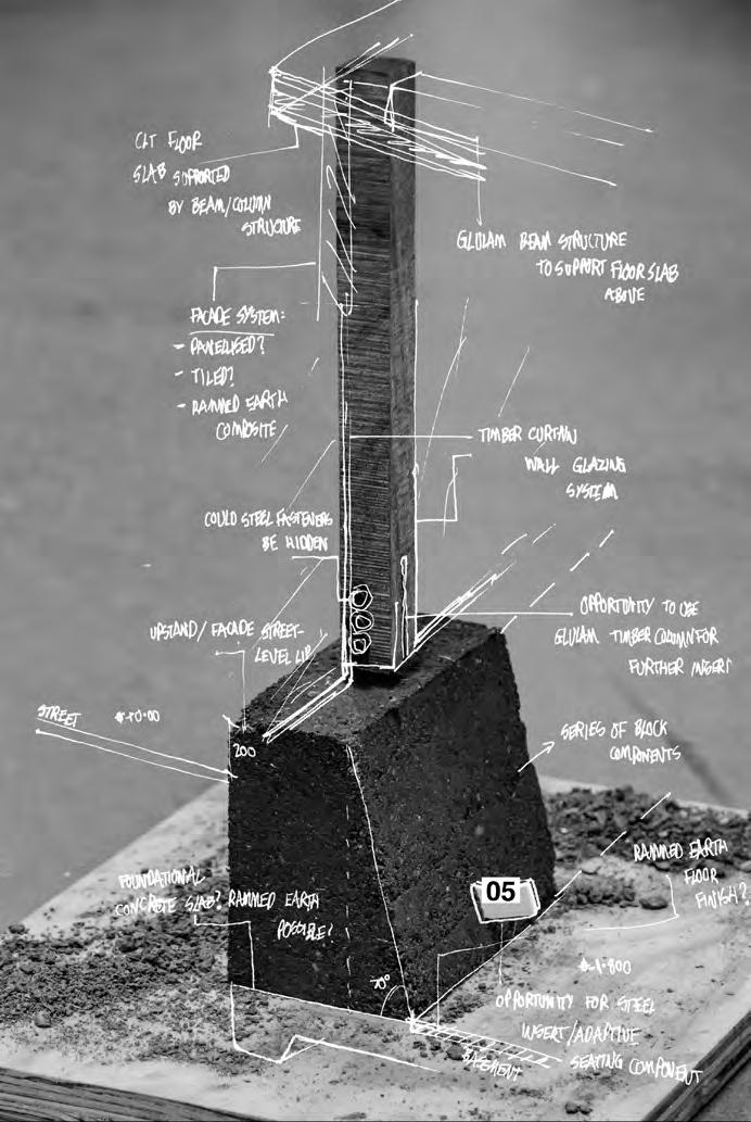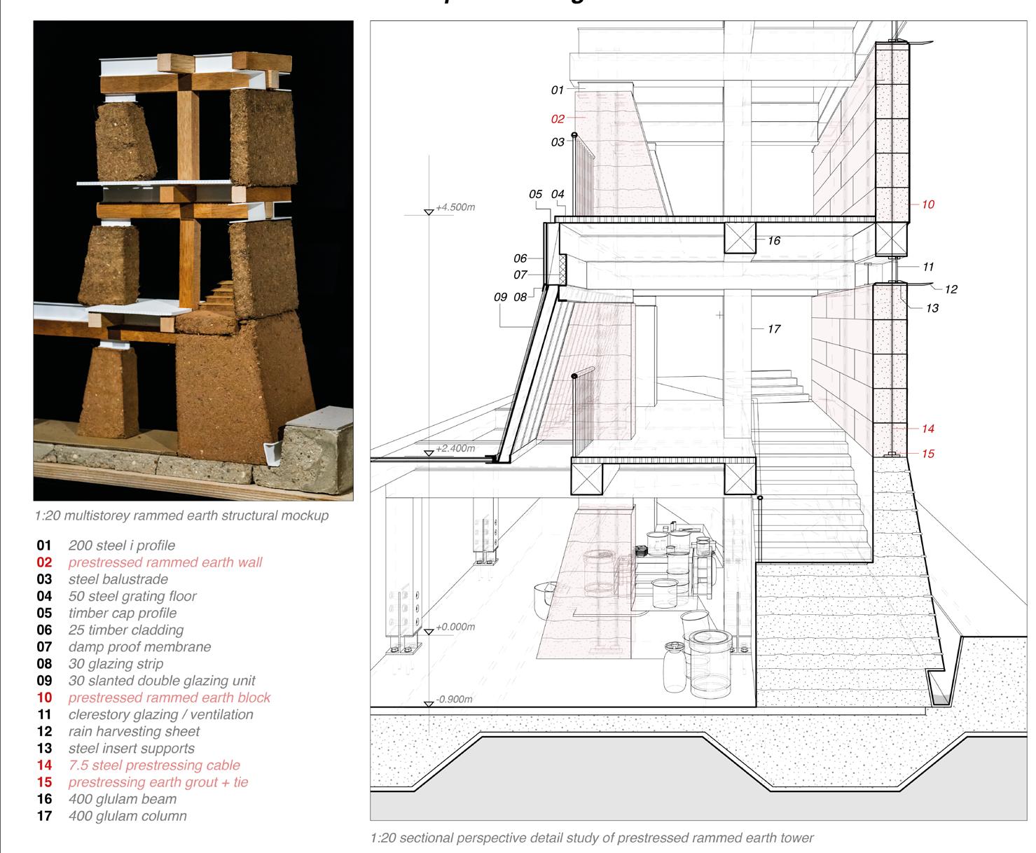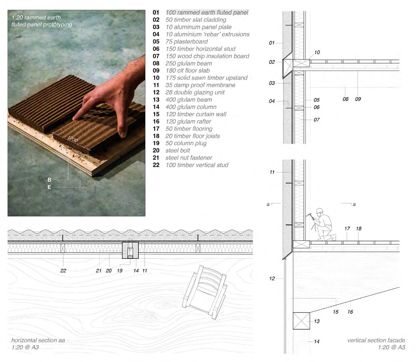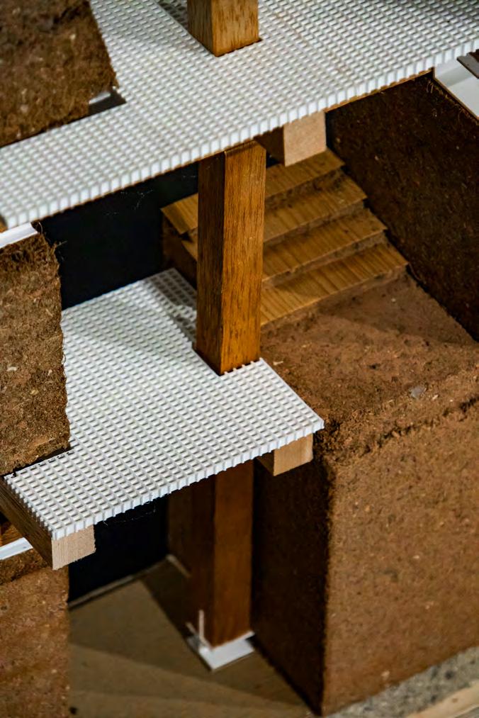 A concurrent technical dissertation focused on the use of rammed earth structural mockups to investigate the feasibility of selfbuild, community-led construction. The physical models tested a variety of floor, wall and facade elements, aiming to demonstrate an intersection between local sourcing, selffabrication and incremental development.