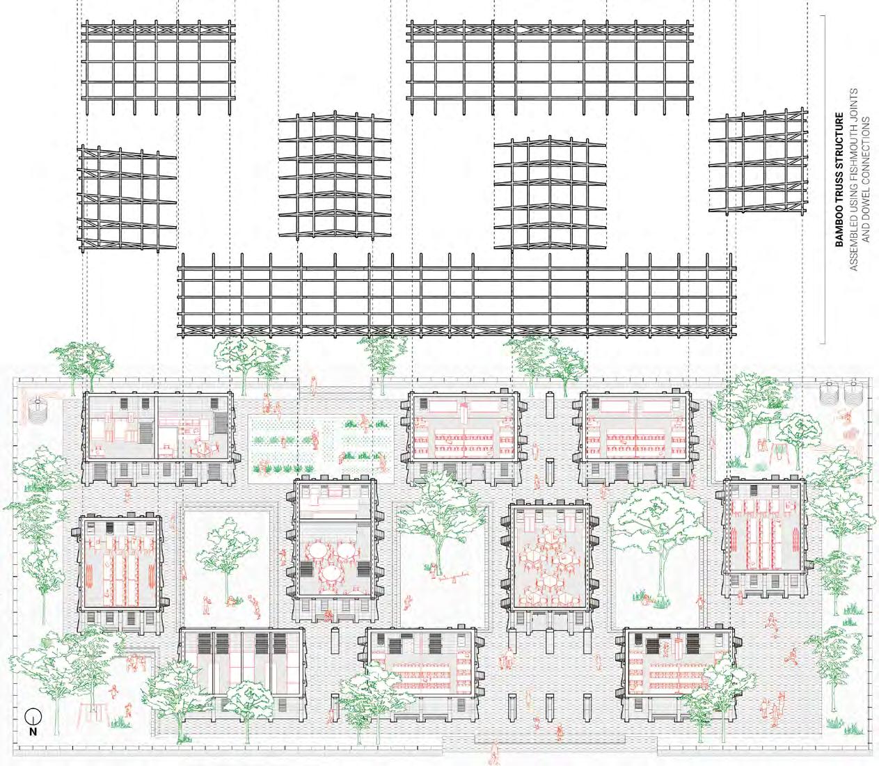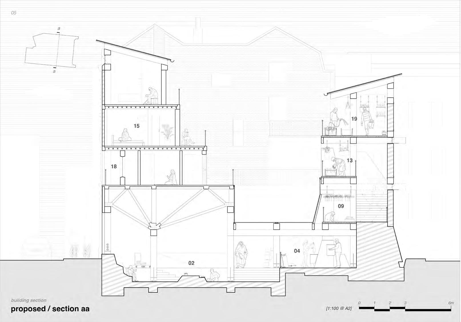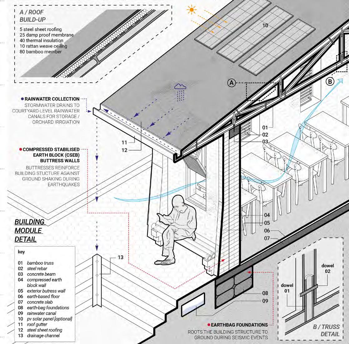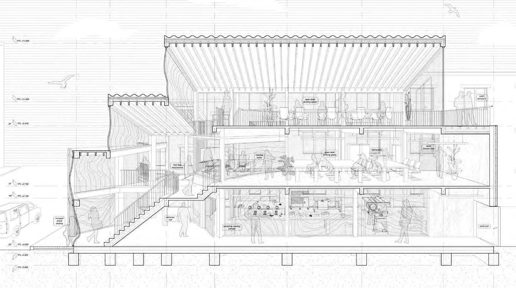 A concurrent technical dissertation focused on the use of rammed earth structural mockups to investigate the feasibility of selfbuild, community-led construction. The physical models tested a variety of floor, wall and facade elements, aiming to demonstrate an intersection between local sourcing, selffabrication and incremental development.