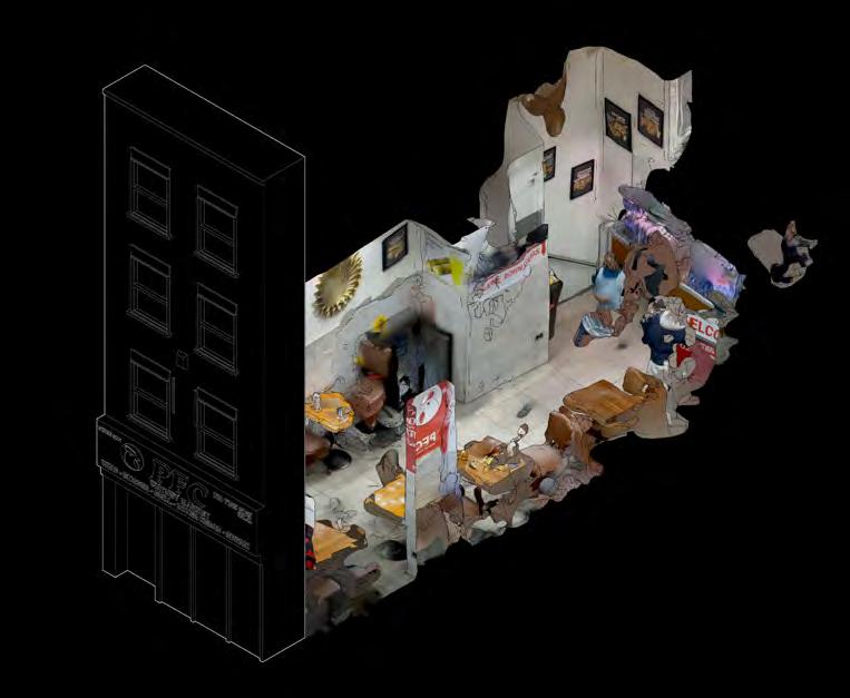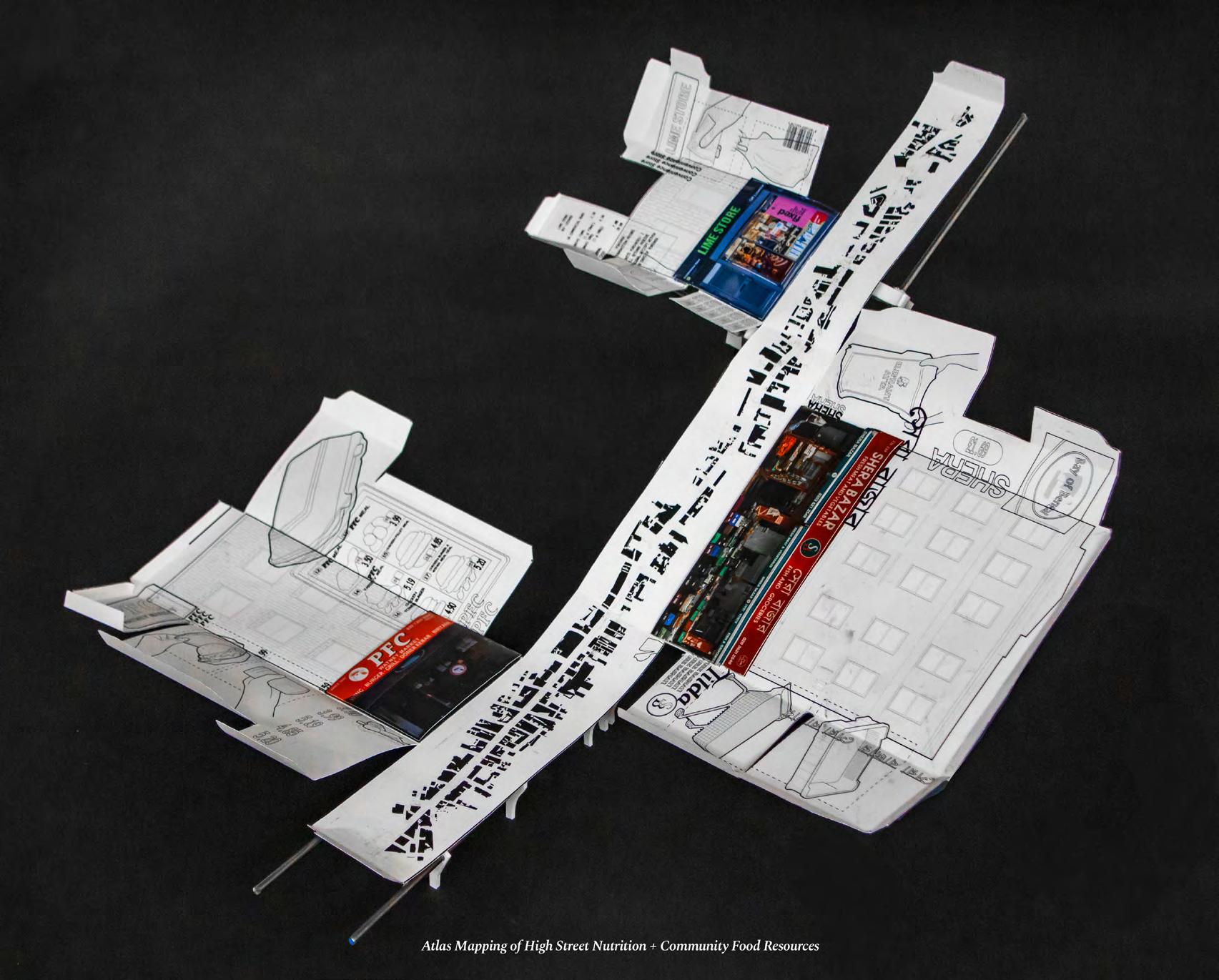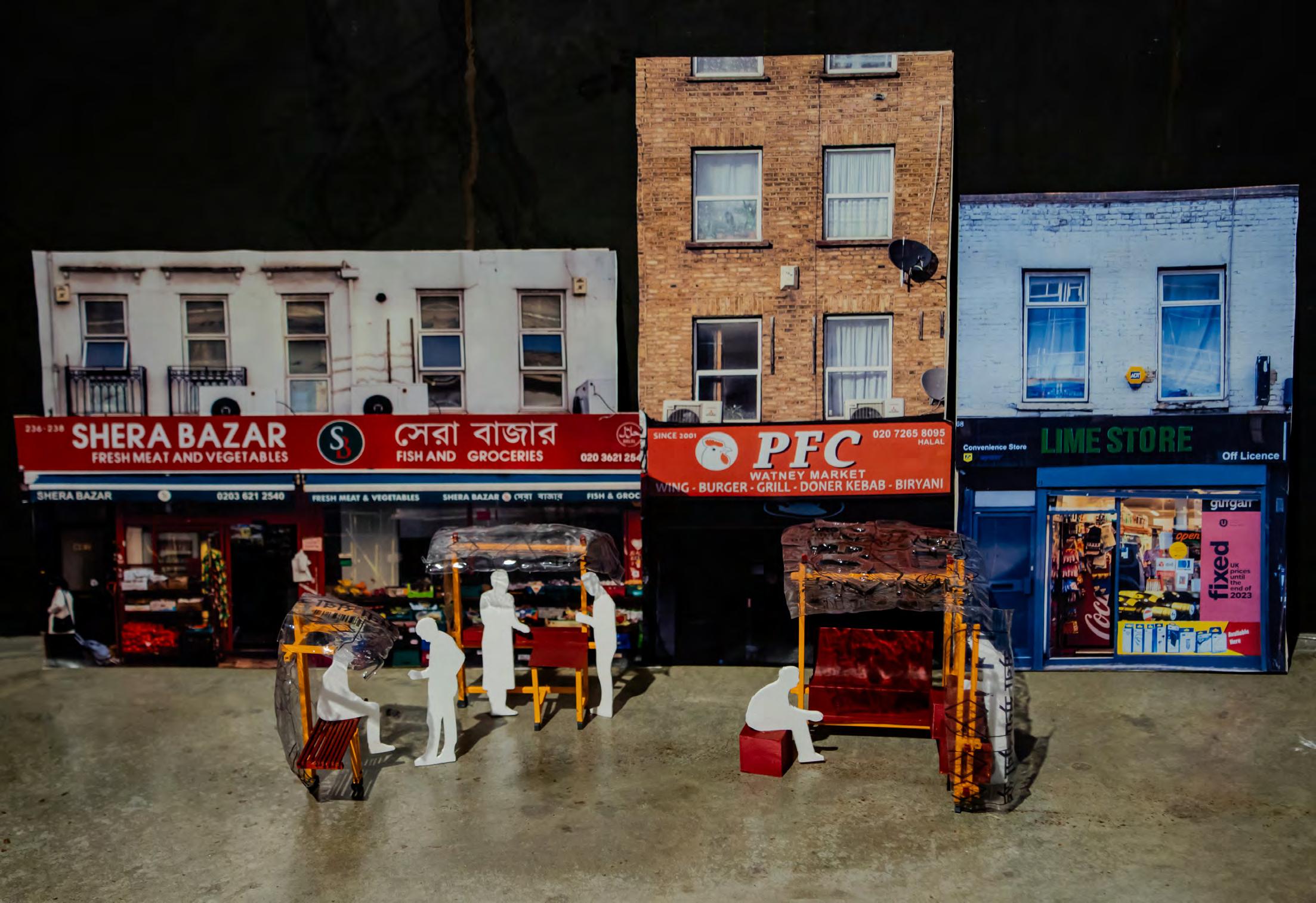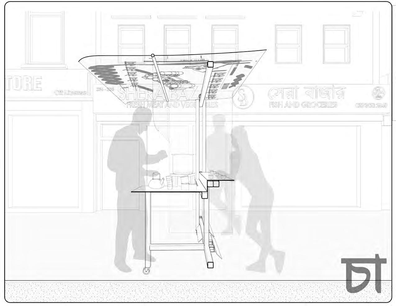 The high street and its facades become the object of urban repair and site of culinary intervention. Repairing to reconnect internalised cultural food systems with externalised culinary gestures, within a context of food practice as foundation for community bonds, high street interventions on Commercial Road seek to implement a series of dynamic installations impacting public + culinary space in the city. The system of repair aims to re-exploit the high street as a key socio-cultural infrastructure in which the local Bangladeshi community roots its physical and cultural identity.